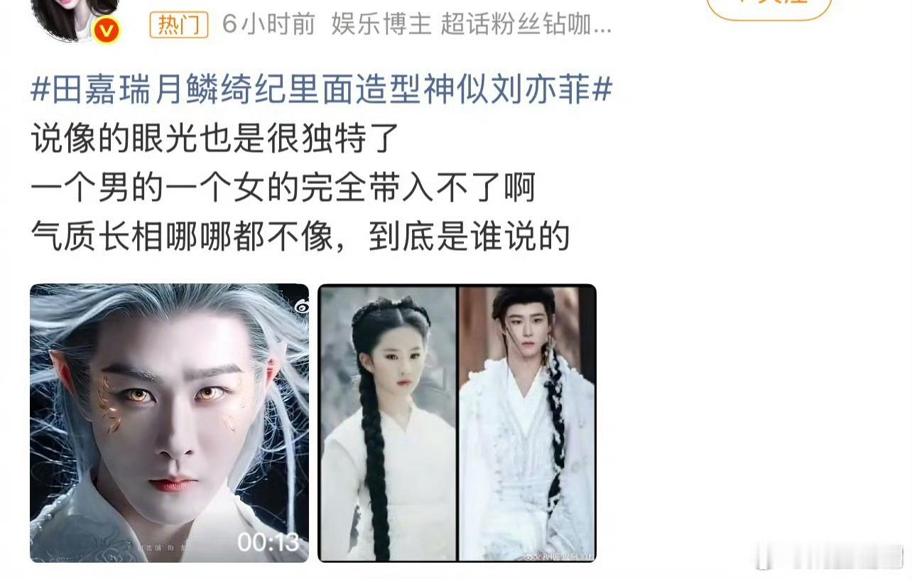 网友说田嘉瑞新剧造型神似刘亦菲? 太会玩梗了