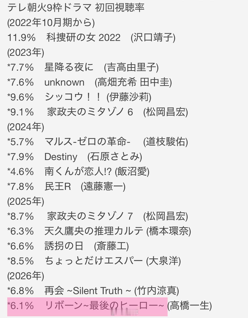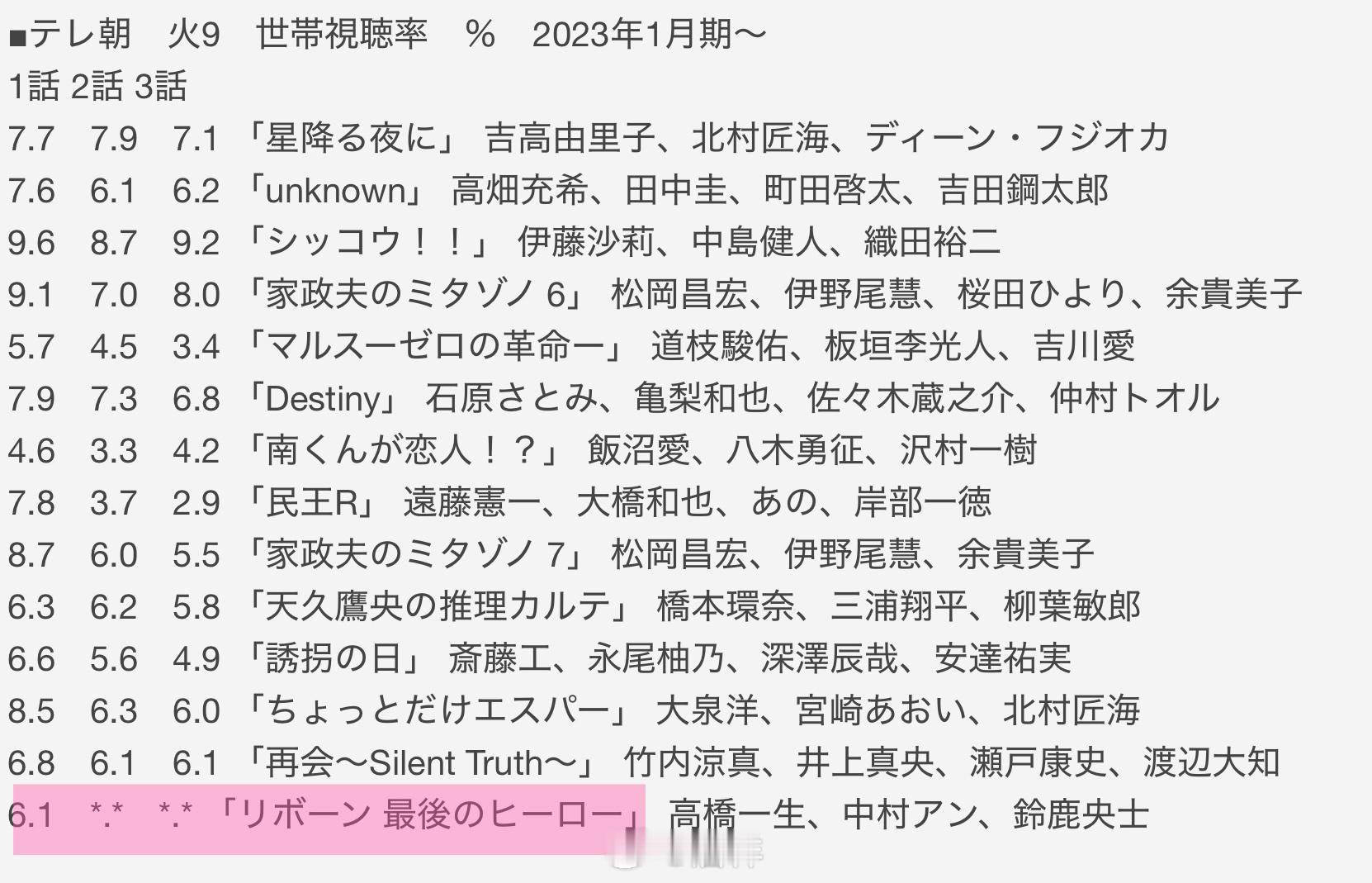 新剧开播:演员高桥一生(45)担任主演的朝日电视台火9连续剧『重生~最后的英雄~』第1集于4月14日播出。据Video Research调查,平均收视率为世代6.1%、个人3.3%。