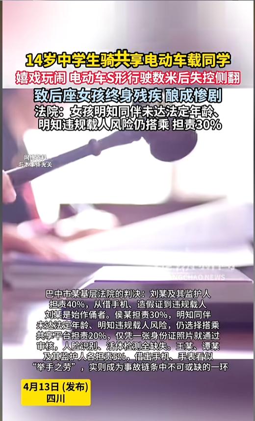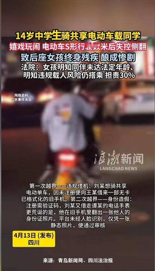 信息来源:《14岁中学生骑共享电动车载同学,嬉戏玩闹,电动车S形行驶数米后失控侧翻,致后座女孩终身残疾,酿成惨剧。》浪潮新闻