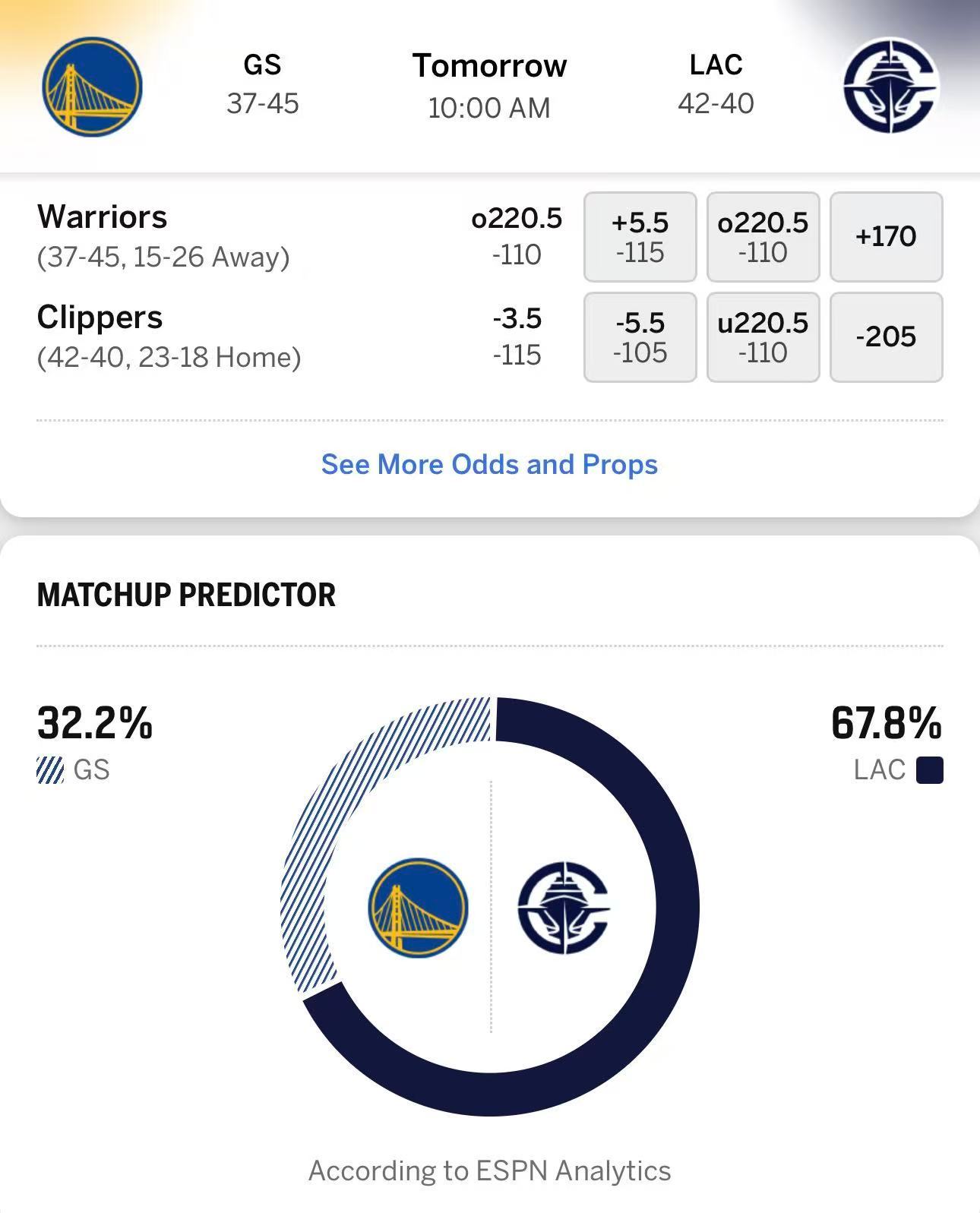 明天的焦点附加赛,快船(9)主场迎战勇士(10),输球一方赛季结束,赢球一方将与太阳/开拓者之间的负者争夺西部第八。