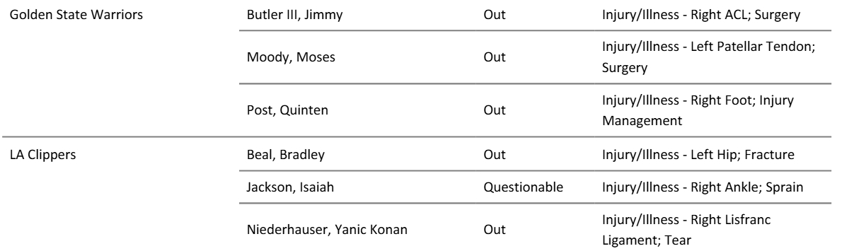 勇士无法出战的球员有:巴特勒,穆迪,波斯特快船无法出战的球员有:比尔,尼德豪泽(以赛亚·杰克逊出战成疑)