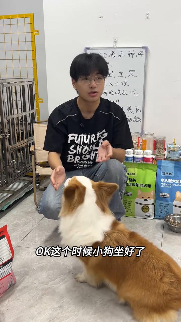 ·小狗到家第一个就是先让它坐好,站在小狗的旁边,然后手往上抬,一直抬,抬到小狗屁股坐下为止,一直抬往后推。