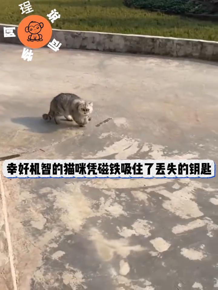 正当主人收拾战利品准备回家时,突然发现家门钥匙不见了,幸好机智的猫咪凭磁铁吸住了丢失的钥匙,立了大功。