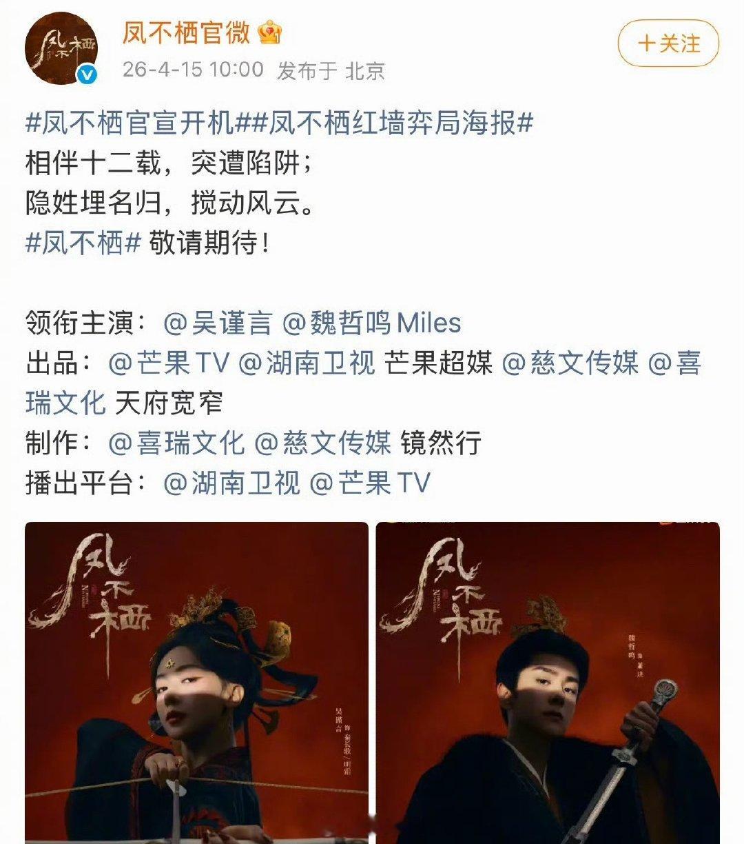 吴谨言魏哲鸣凤不栖单人海报吴谨言魏哲鸣古偶cp感 呀呀呀呀呀。看到吴谨言和魏哲鸣在电视剧《凤不栖》的单人海报,又是被吴姐的气场惊艳到的一天!!吴谨言和魏哲鸣这个古偶cp感绝了啊,首次合作的两位,居然莫名的般配,等不及要追剧了!!!