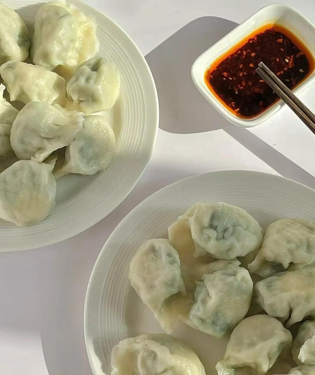水开下饺子,点三次凉水,饺子浮起就熟啦,蘸醋+辣椒油,香到停不下来。