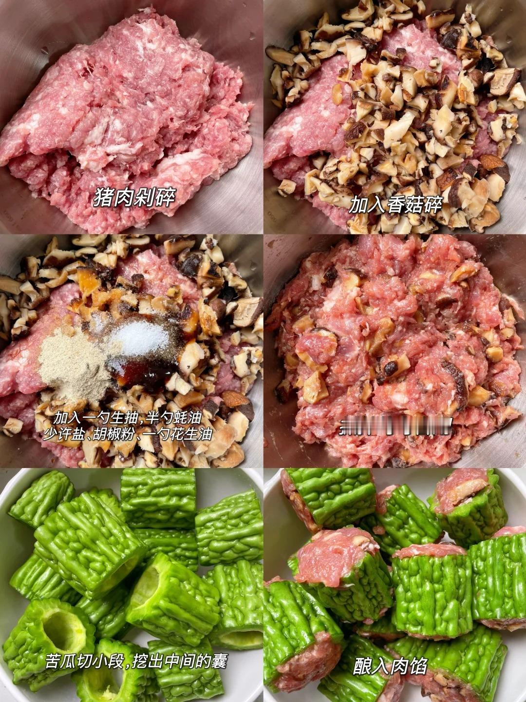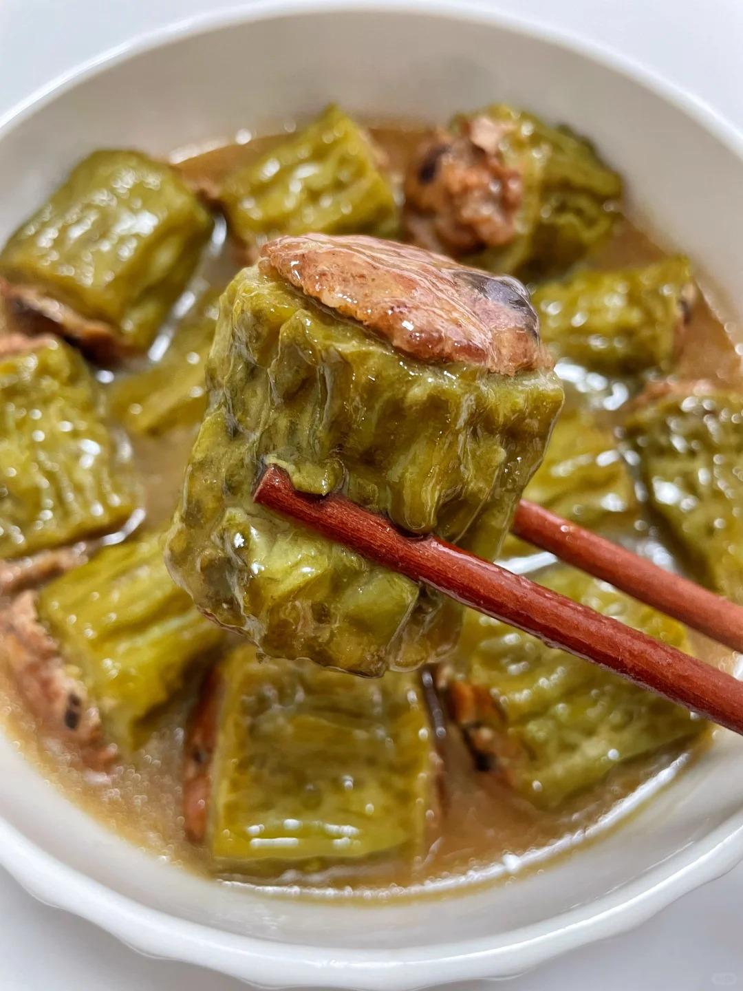 我也不知道为什么苦瓜放久的会变好吃,味道就是不一样。有时候特意中午做好,留着晚餐吃,里面的肉馅吃起来嫩嫩的,有香菇的干香,搭配着酱汁,好吃到停不下来。