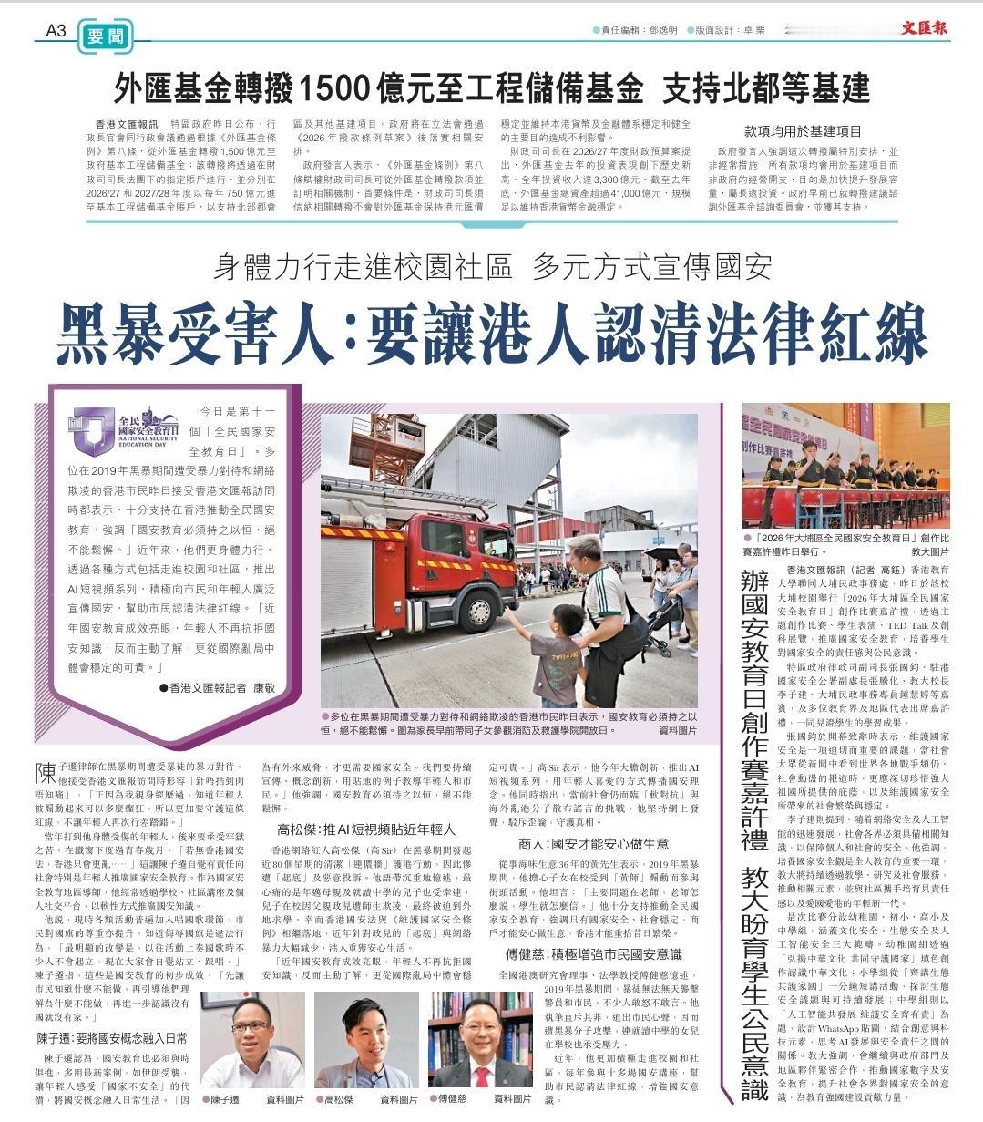 今日是第十一个「全民国家安全教育日」。多位在2019年修例风波期间遭受暴力对待和网络欺凌的香港市民接受媒体访问时都表示,十分支持在香港推动全民国安教育,强调「国安教育必须持之以恒,绝不能松懈。」近年来,他们更身体力行,透过各种方式包括走进校园和社区,推出AI短视频系列,积极向市民和年轻人广泛宣传国安,帮助市民认清法律红线。