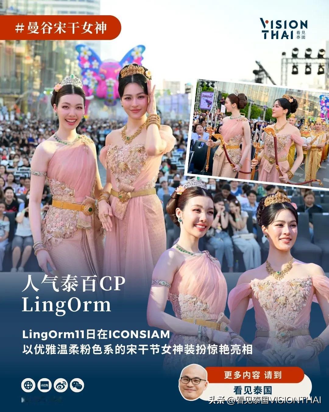 爆红的邝玲玲Lingling与Orm Kornnaphat,今年4月11日在ICONSIAM以温柔的粉色系色调的宋干节女神装扮惊艳亮相,简直像是从古装剧里走出来的神仙。现场互动、合照都甜到让粉丝欢呼。