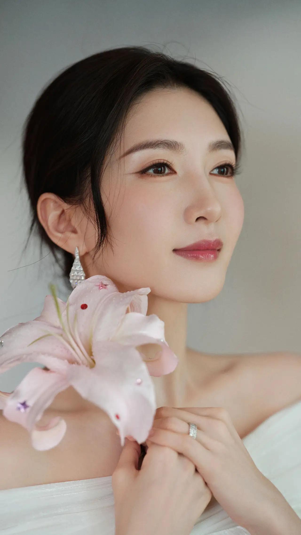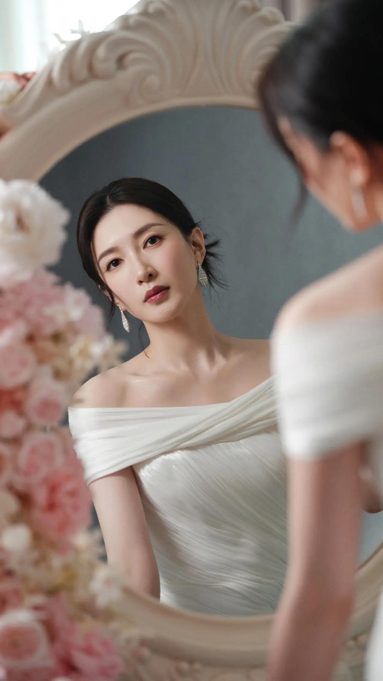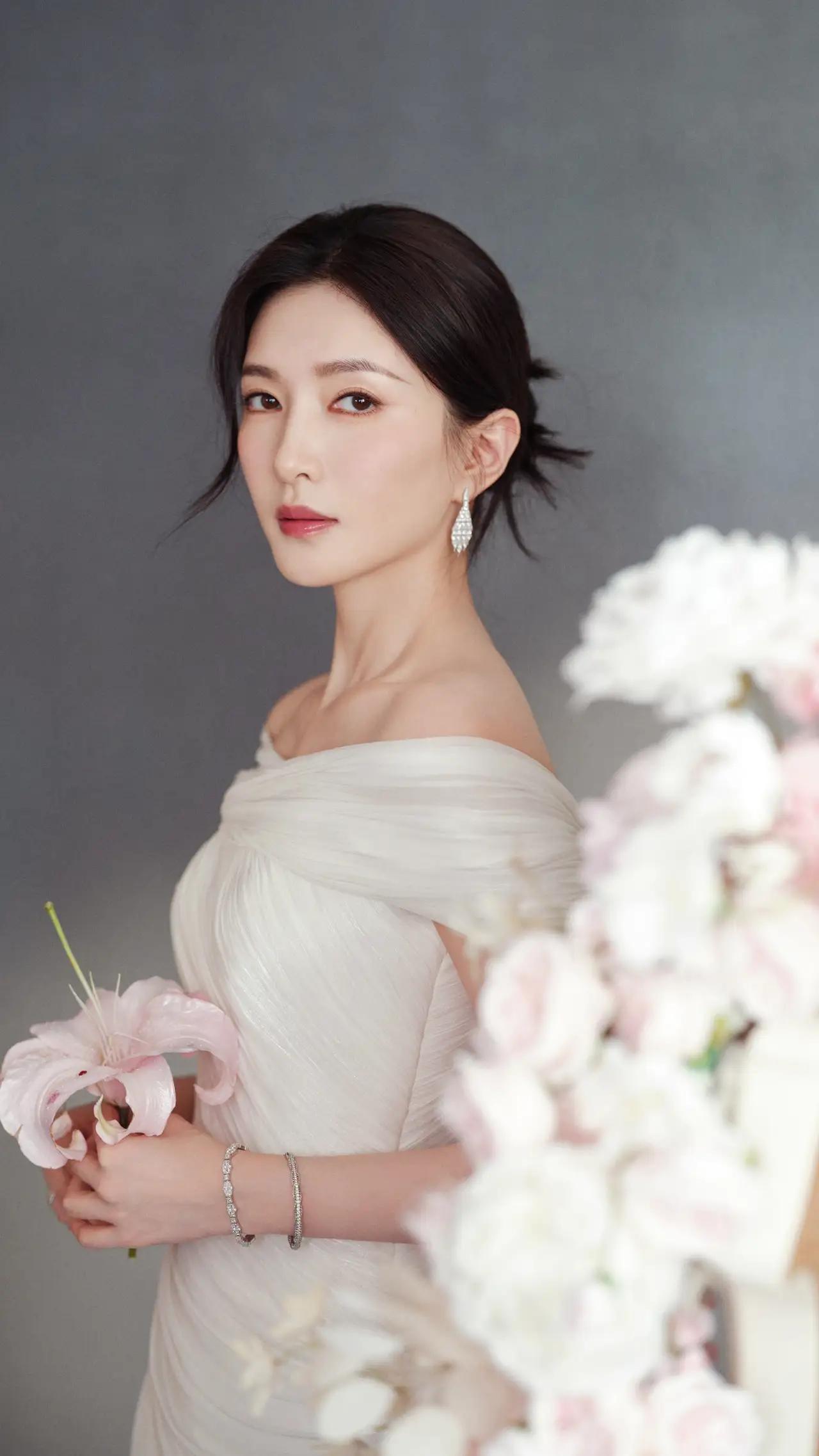 美女壁纸~江疏影,白纱为衣,光影为诗。 江疏影一袭一字肩褶皱婚纱,搭配碎钻耳饰,