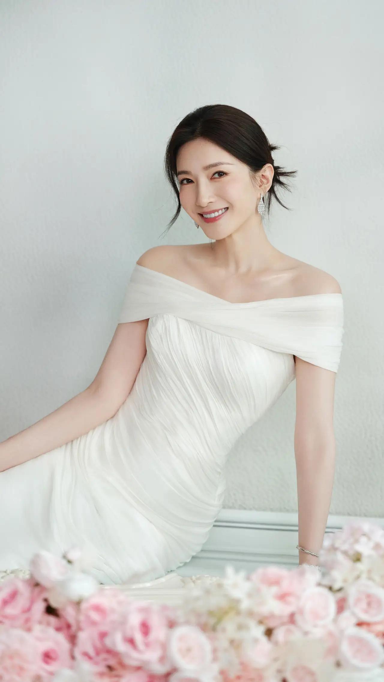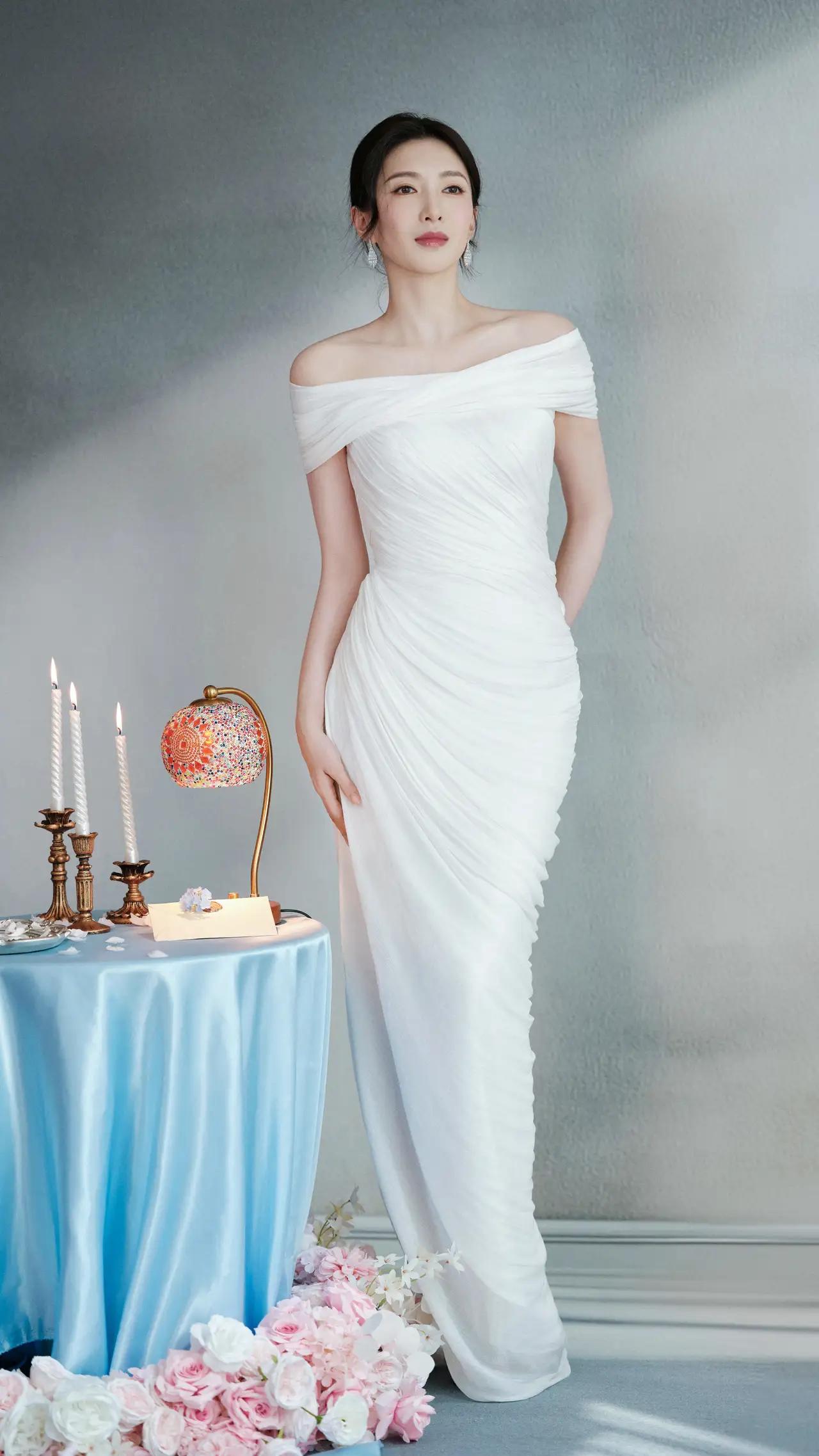 江疏影一袭一字肩褶皱婚纱,搭配碎钻耳饰,将优雅与松弛感拉满