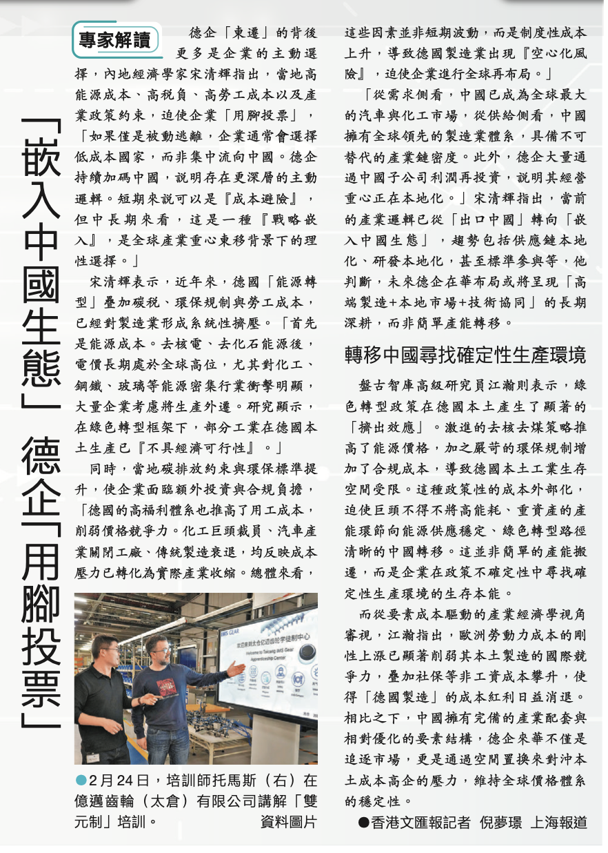 #德企东迁# 【专家解读】“嵌入中国生态”,德企“用脚投票”。据香港文汇报,德企东迁的背后更多是企业的主动选择,内地经济学家宋清辉指出,当地高能源成本、高税负、高劳工成本以及产业政策约束,迫使企业“用脚投票”,“如果仅是被动逃离,企业通常会选择低成本国家,而非集中流向中国。德企持续加码中国,说明存在更深层的主动逻辑。短期来说可以是『成本避险』,但中长期来看,这是一种『战略嵌入』,是全球产业重心东移背景下的理性选择。”#经济学家宋清辉#