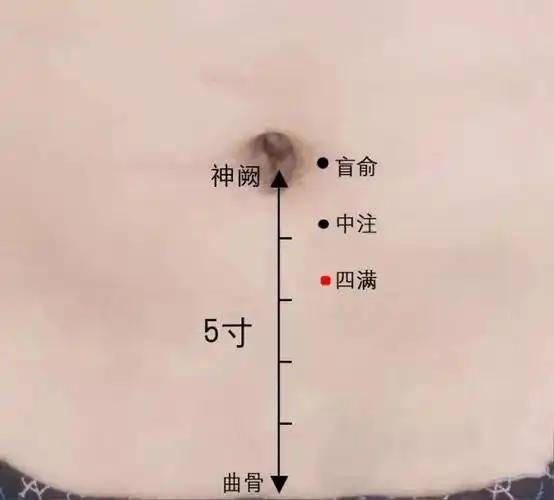 更准确的方法是:从肚脐正中直下2寸(约自己两指宽度)是石关穴,从石关穴再往下2寸(又是两指宽度),到达脐下4寸的位置。从这个点向左侧或右侧水平旁开,取半寸(约大拇指横宽的一半)。在这条竖直线与水平线的交汇处,按压有沉实酸胀感,就是四满穴。