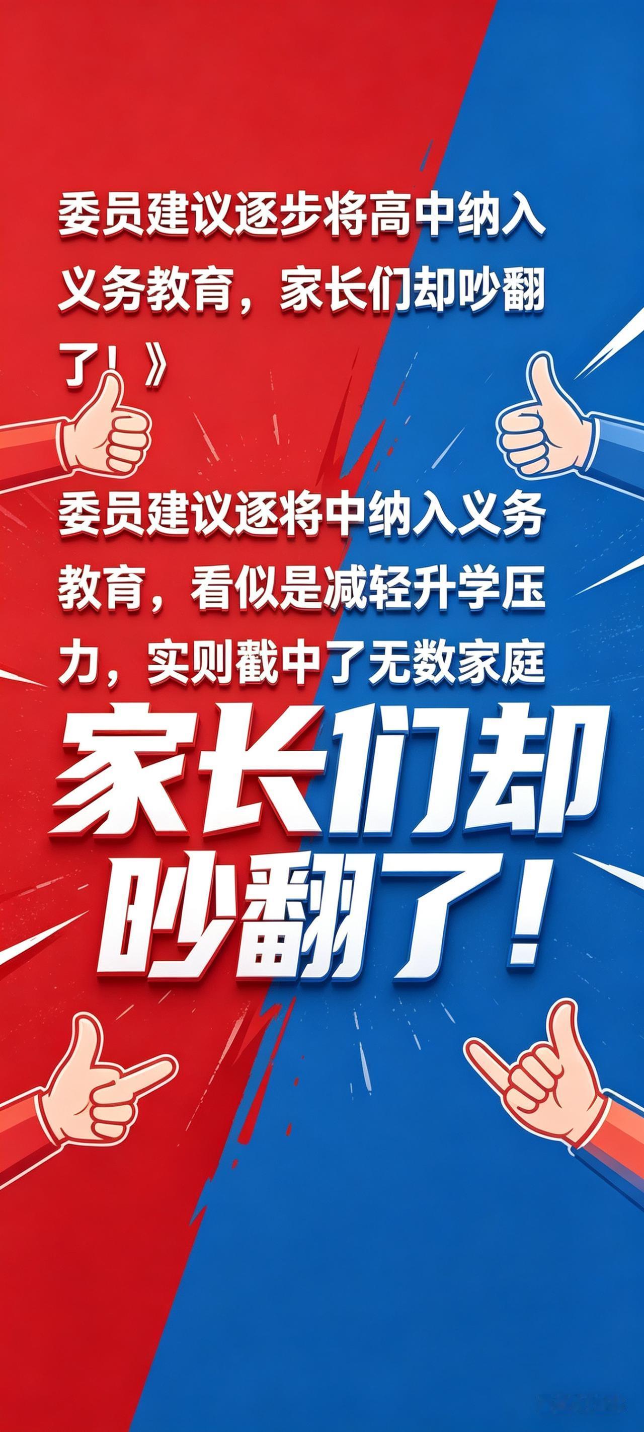 今年两会最戳家长心窝的建议来了!多位委员发声:推行12年义务教育,把高中纳入义务教育范畴,将中考普职分流延后到高考阶段!消息一出,全网家长直接分成两大阵营,吵到停不下来🔥