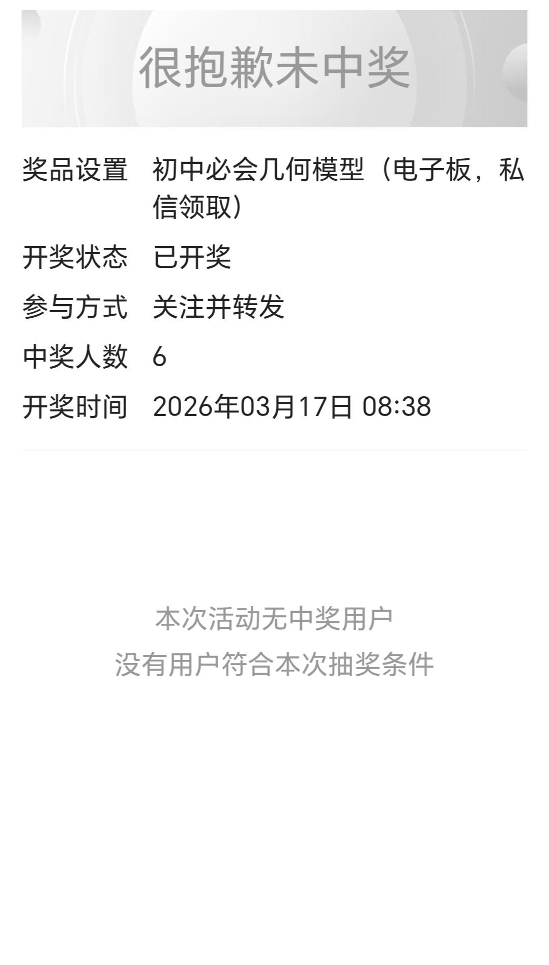 原定抽6位送初中几何模型电子版,结果开奖的时候,系统直接显示「无中奖用户」,6个名额全空了,我真的又急又无奈!