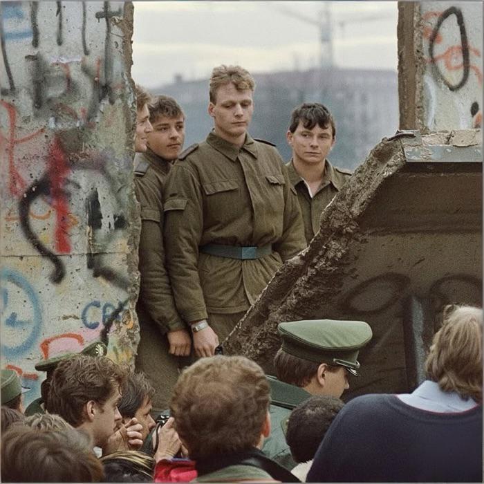 士兵们甚至枪械都没佩戴,只是沉默注视着曾经由他们把守、如今边界已不复存在,柏林民众可以自由穿行,铁幕崩解,而他们也成了旧秩序最后的见证者!