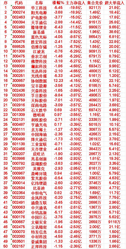 4月15日中午收盘,主力资金“大幅卖出”的50名单:
