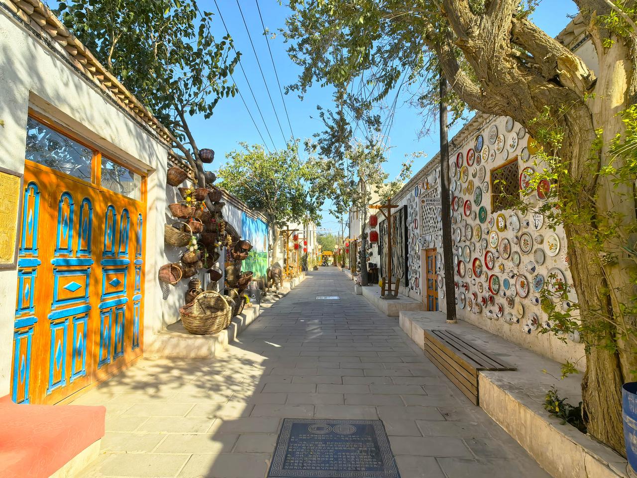 热斯坦路的夯土墙曾历经风雨,门巴扎就是老门脸的守望者,彩绘木门在阳光下泛着温暖的光泽,路边的店铺琳琅满目,灯笼在微风中轻轻摇曳,就像是在讲述着丝绸之路上那些悠远的传说。