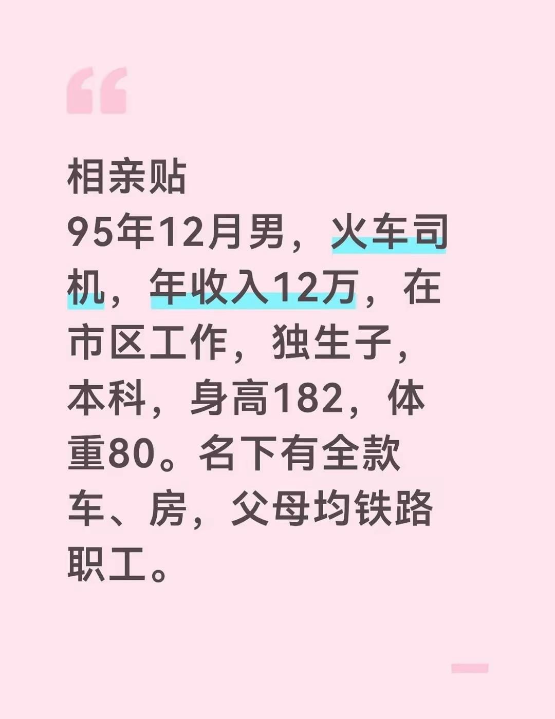 最近,一位衡水95后火车司机的相亲条件引发热议:95年12月出生,本科学历,身高182cm、体重80kg,市区工作,独生子,税后年收入12万+,名下148平全款房、有车,父母还是铁路双职工。