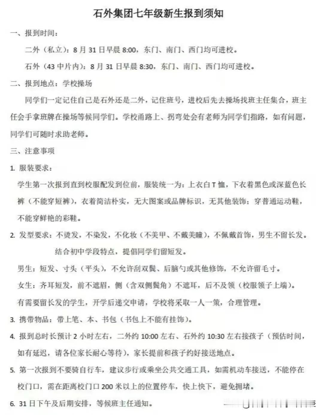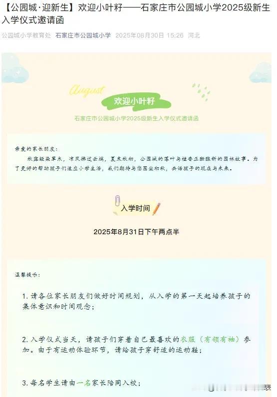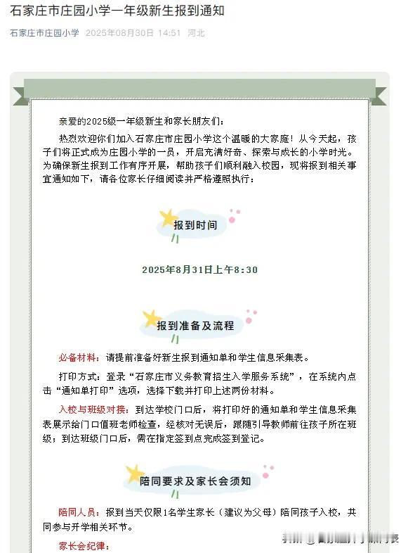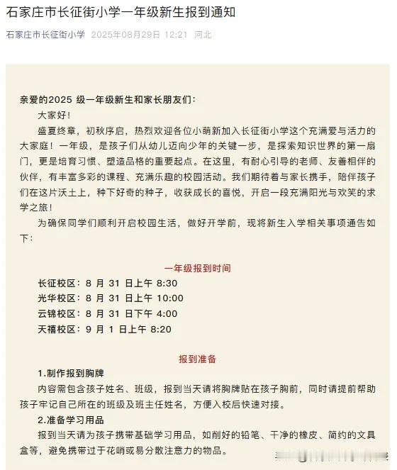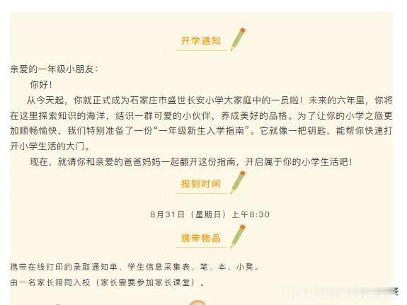 这两天是各大小学、初中的报到时间!很多学校都在官微发布了报到通知,通知里面有一些报到细节比如时间、地点、所需携带的证件,还会有更细致的例如着装、交通。初中还会要求发型。这个各校要求不同,按照学校要求准备就好。如果没有通知,那估计报到后会有相关详细的要求。今年涉及到幼升小、小升初的家长务必多了解,多上上心。