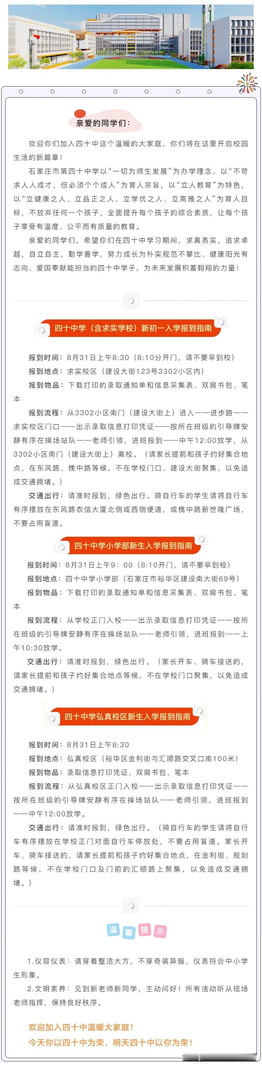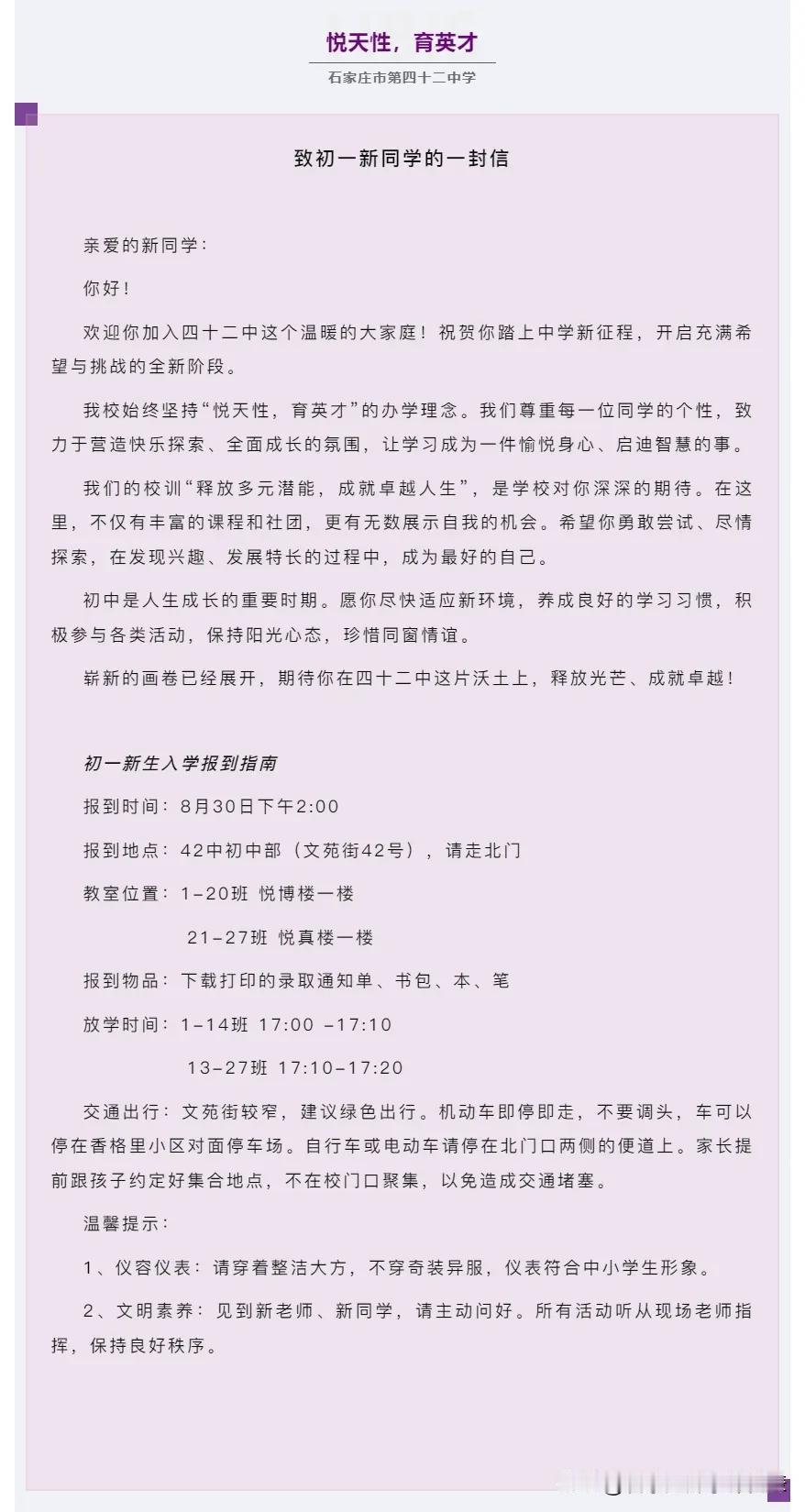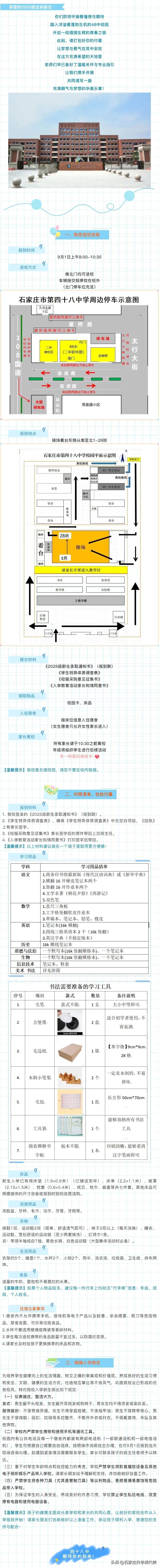 这两天是各大小学、初中的报到时间!很多学校都在官微发布了报到通知,通知里面有一些报到细节比如时间、地点、所需携带的证件,还会有更细致的例如着装、交通。初中还会要求发型。这个各校要求不同,按照学校要求准备就好。如果没有通知,那估计报到后会有相关详细的要求。今年涉及到幼升小、小升初的家长务必多了解,多上上心。