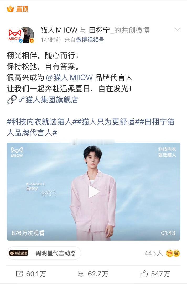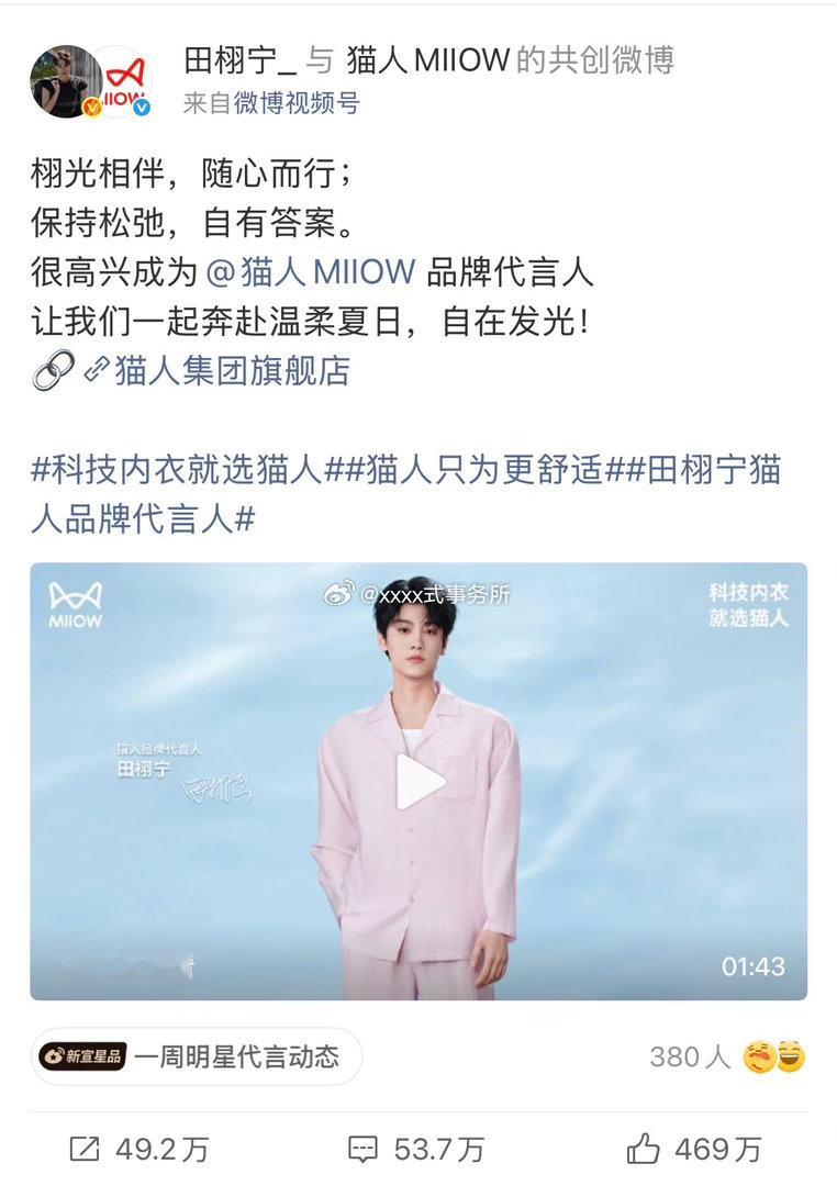 田栩宁猫人品牌代言人官宣,ppf版头置顶已换,大屏也好多,待遇不错呀