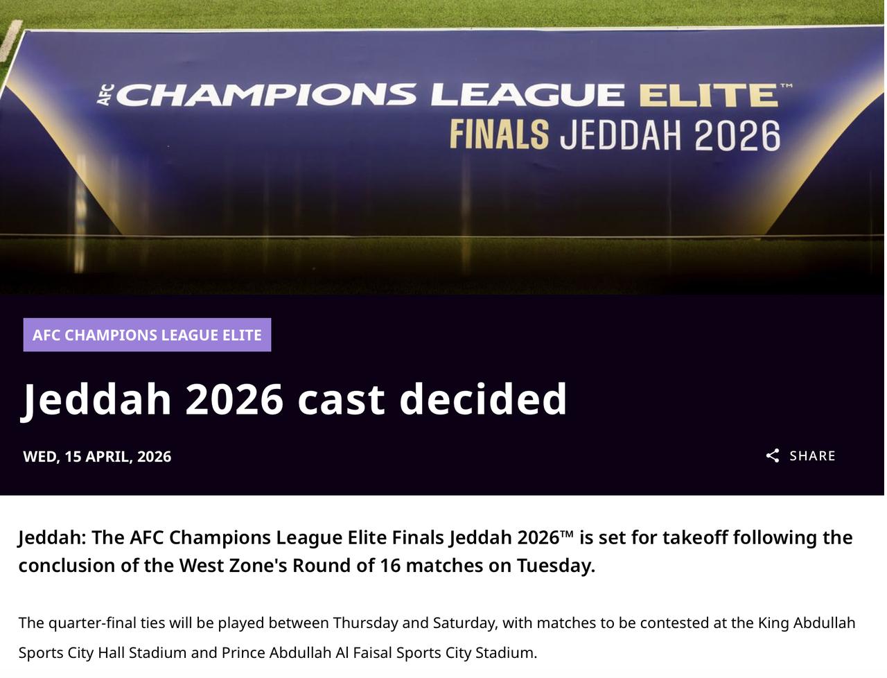 随着北京时间15日凌晨吉达联合以1比0淘汰阿布扎比统一,2025-2026赛季亚冠精英联赛西亚大区1/8决赛赛会制比赛打完,进入赛事1/4决赛的全部8强产生,赛程及具体对阵结果也全部出炉。亚足联北京时间15日上午确认,1/4决赛的4场比赛将按计划于当地时间本周四(4月16日)至周六(4月18日)在沙特吉达阿卜杜拉国王体育城体育场及费萨尔王子体育场进行。