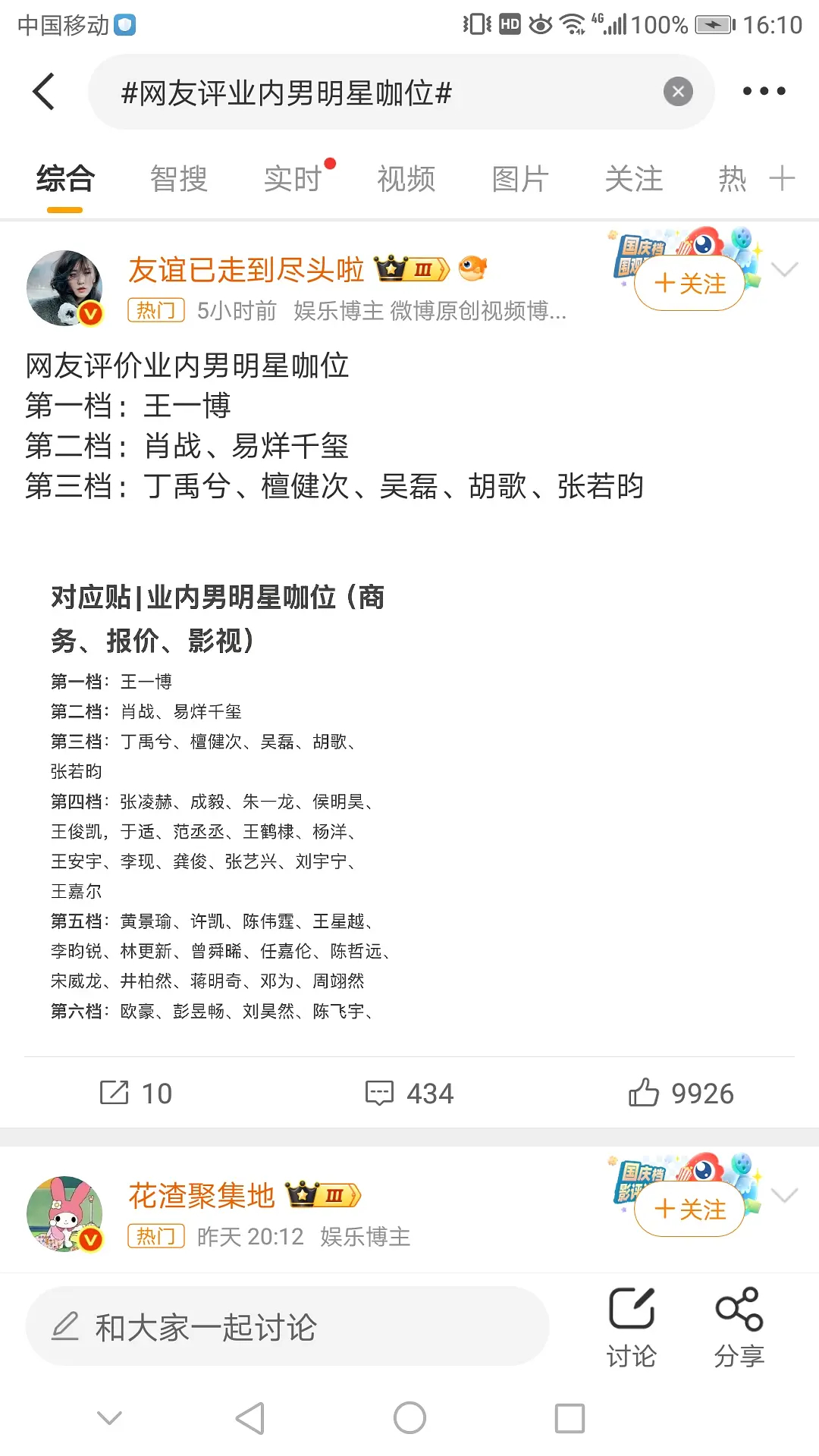网友评业内男明星咖位…王一博唯一一个第一档,肖战易烊千玺同属第二档。不敢苟同,
