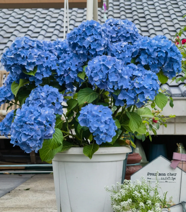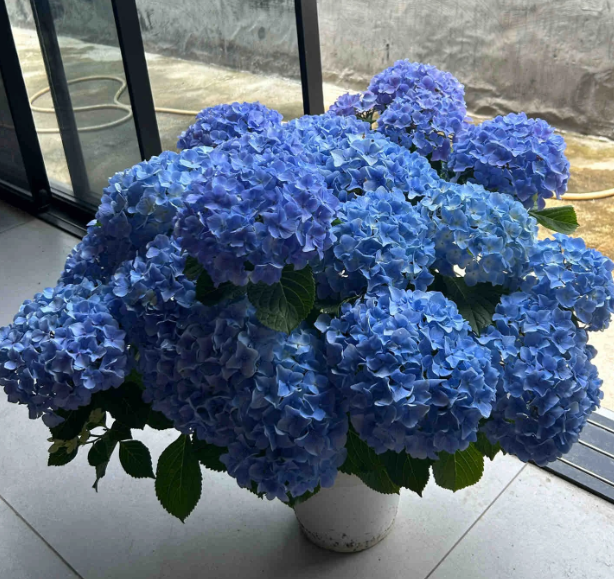 “大海蓝”是灌木绣球,地栽能长到一米多高。阳台盆栽也完全没问题。空间大咱们就用大盆养,开花更多,空间小用小一点的花盆养,每年修剪少留几个枝条,一盆开个十几个大花球,也一样震撼。