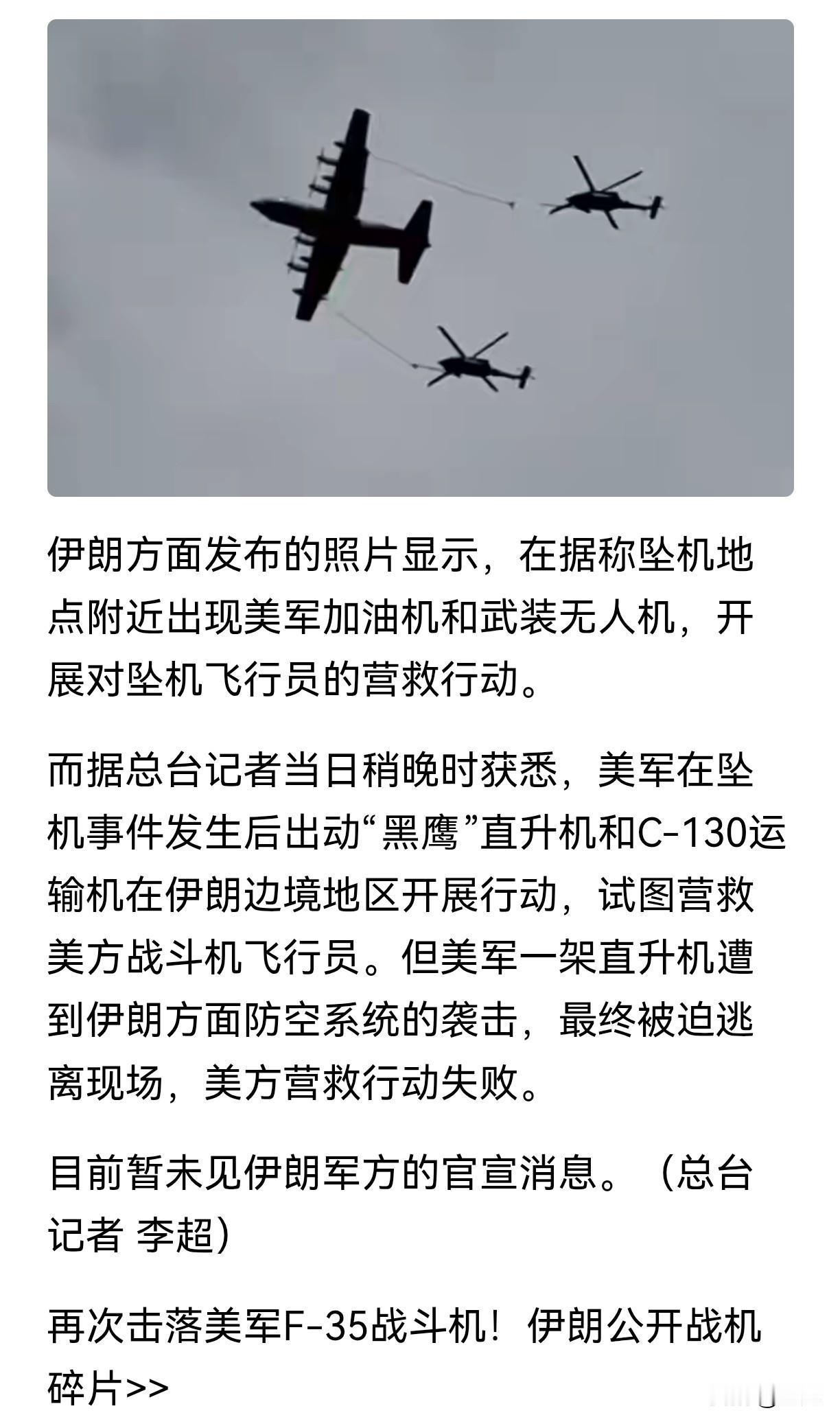 美军飞行员被伊朗俘获特朗普再也无法隐瞒。目前结合双方的报道,飞机是不是被击落了,怎么被击落的,还很难确定。但有美军飞行员降落在伊朗境内这一点是确定的,美军试图营救但没有成功,伊朗或者正在悬赏捉拿,或者已经抓住正在进一步处理。