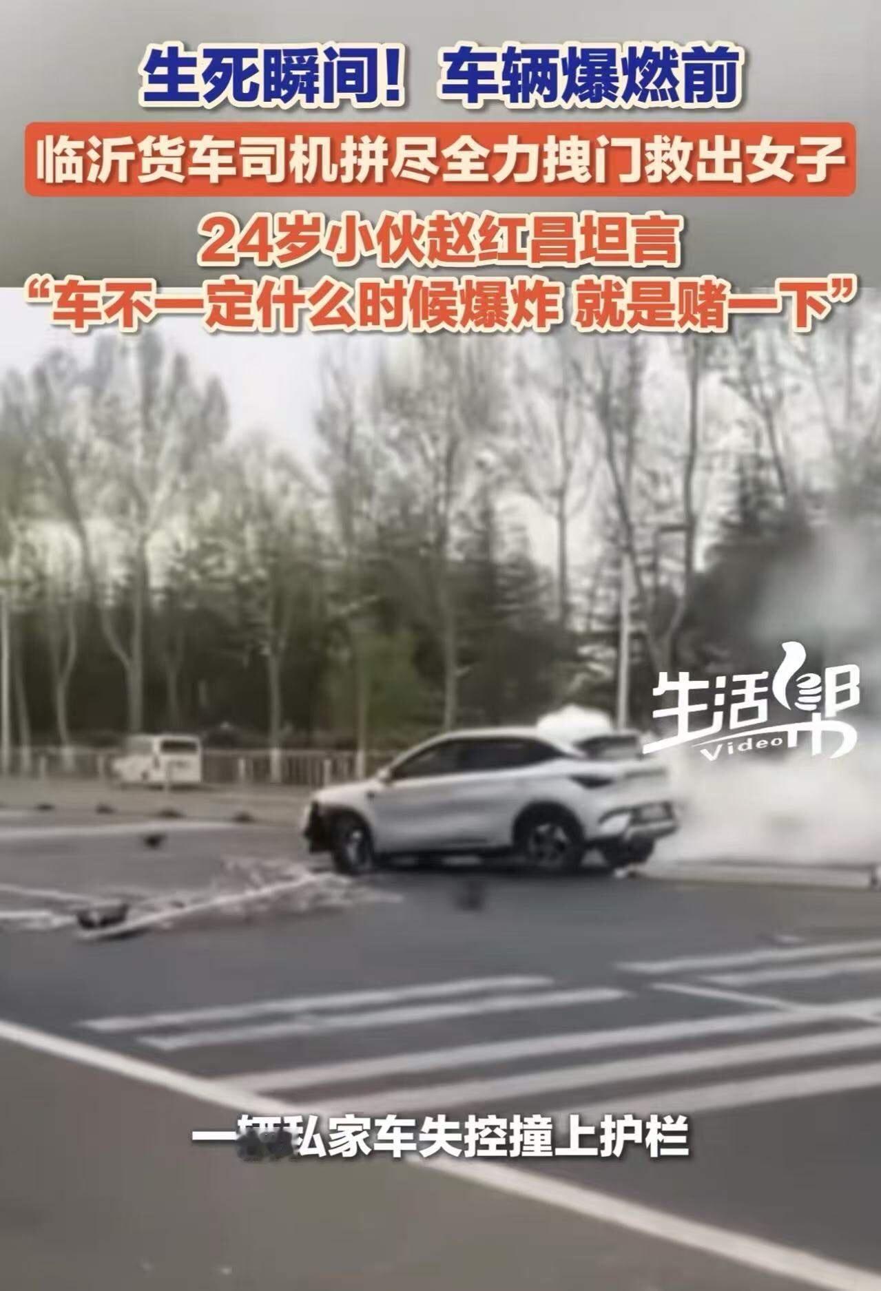 “跟死神抢人!”车辆爆燃前,临沂货车司机徒手拽门救出女车主,5分钟后车辆烧成空壳!网友:就问俺山东人中不中?