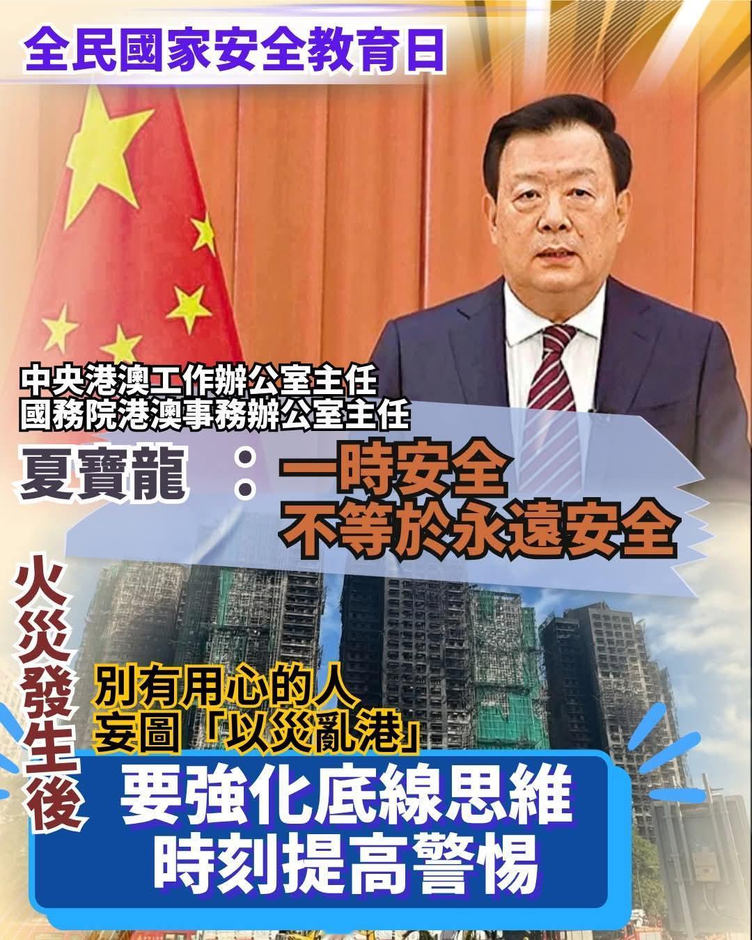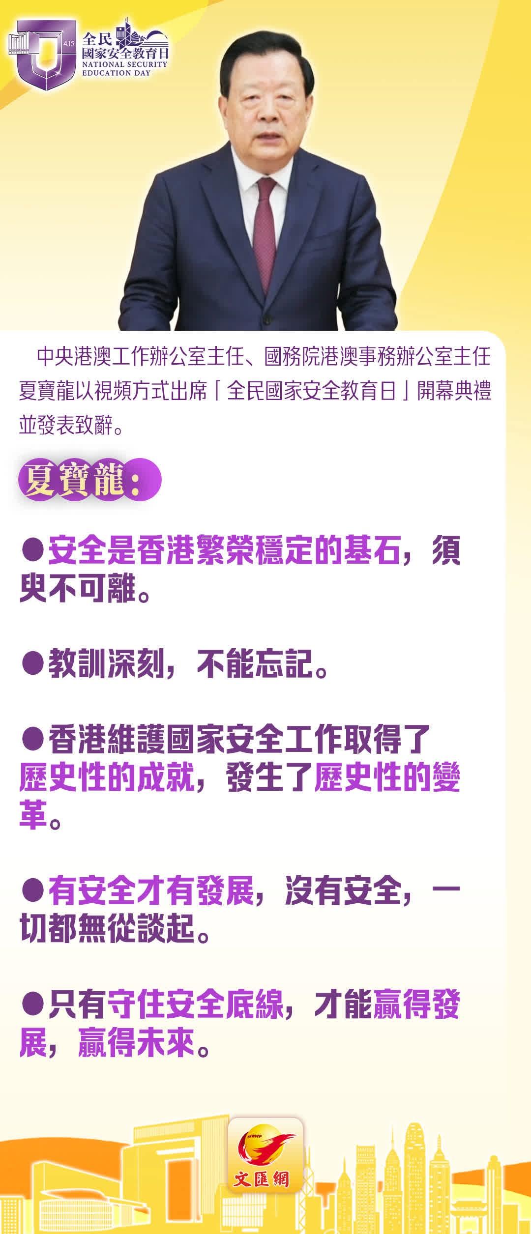 「全民国家安全教育日」开幕典礼暨主题讲座15日在香港会议展览中心新翼大会堂举行。港澳办夏主任以视频方式出席开幕典礼,并发表题为「以高水平安全护航香港由治及兴 开创「十五五」时期「一国两制」事业新局面」的主旨致辞。夏主任表示,以高水平安全护航香港由治及兴,需要清醒认识安全不是一劳永逸的。对影响香港繁荣稳定的各种风险隐患时刻保持警惕。安全是一个动态发展的过程,一时的安全不等于永远的安全,现在的安全不等于今后的安全。