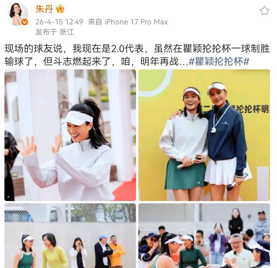 4月15日中午12:49,朱丹晒出了几张运动照,配文:现场的球友说,我现在是2.0代表,虽然在瞿颖抡抡杯一球制胜输球了,但斗志燃起来了,咱,明年再战……