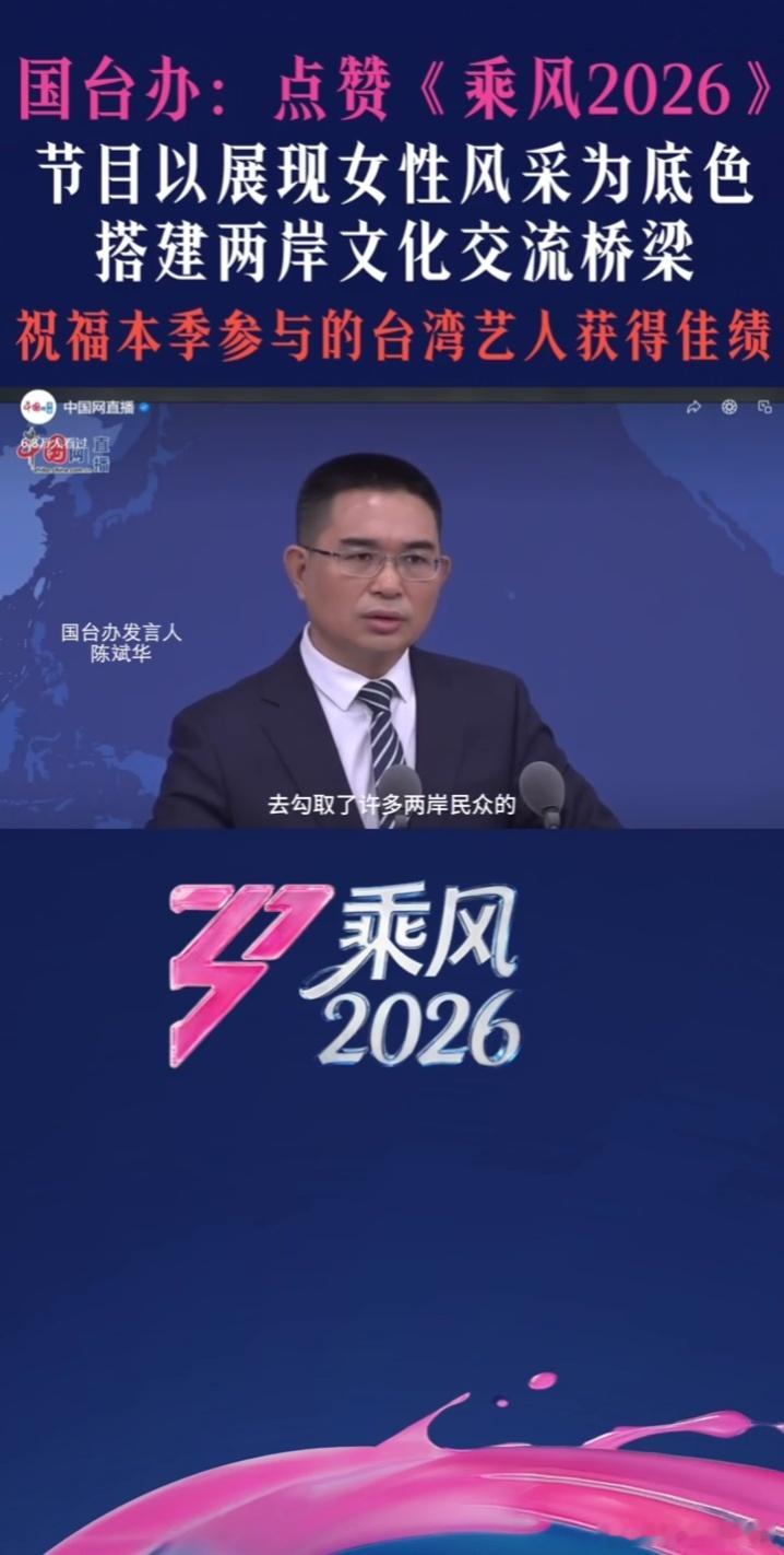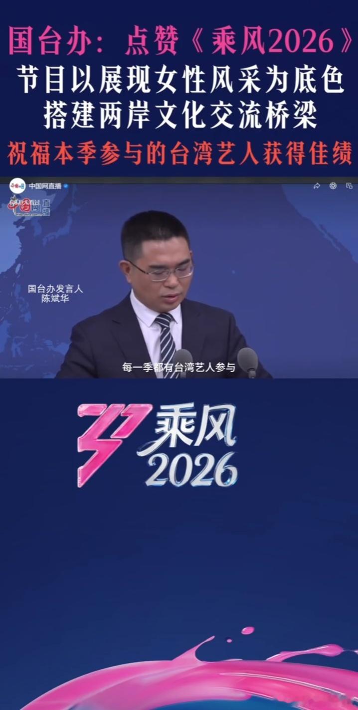 国台办:欢迎更多台湾艺人参与!《乘风2026》是文化交流的温暖桥梁。国台办点赞乘