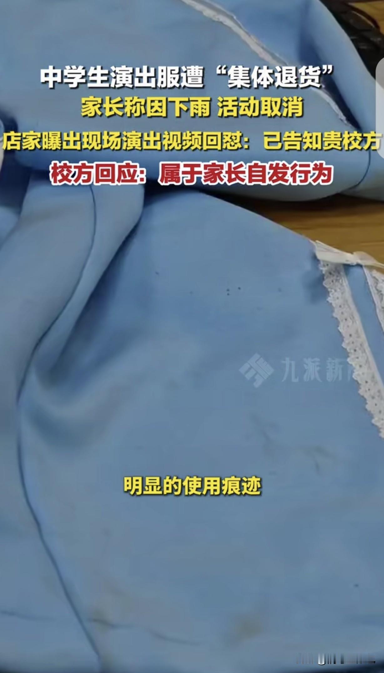 可没过几天,傻眼了。11个家长申请退货,理由五花八门:尺寸不合适、质量有问题、天气不好演出取消了。统一的说法是"下雨了,演出取消了"。徐先生一开始还想,天有不测风云,取消也正常。可收到退货打开包裹的那一刻,一股汗味扑面而来。