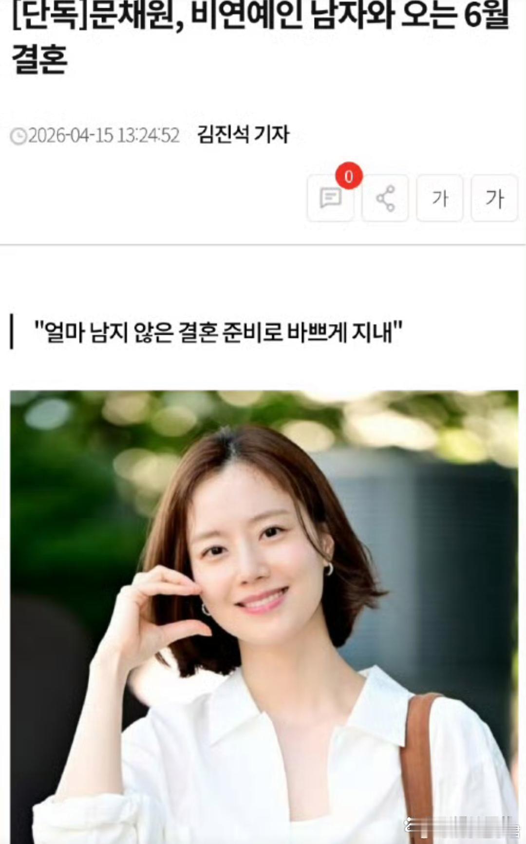 文彩元6月结婚据韩媒,演员文彩元宣布将在6月和素人男友结婚,并上传手写信。据相关