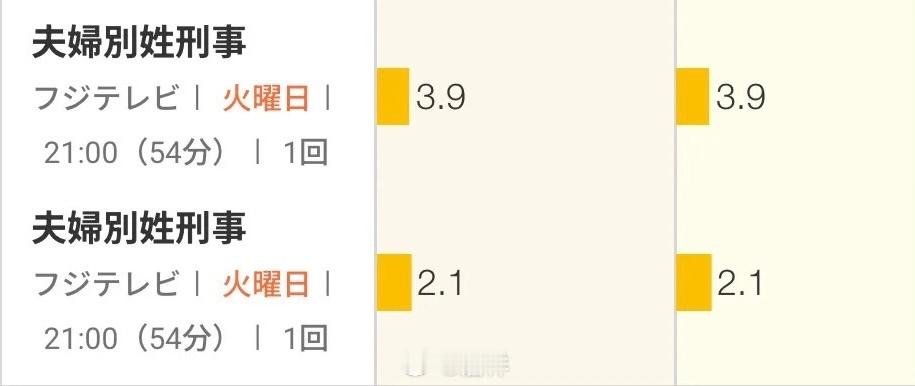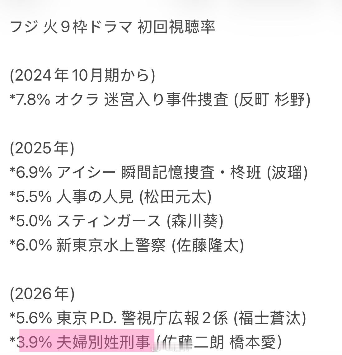 新剧开播:演员佐藤二朗(56)与桥本爱(30)共同主演的富士台9连续剧『夫妇别姓刑警』第1集已于4月14日播出,首集世代收视为3.9%,个人收视为2.1%。