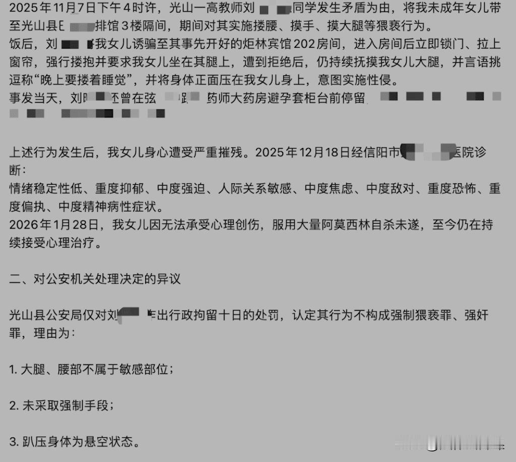 河南信阳,男子得知自己15岁的女儿被54岁班主任猥亵,从而产生了重度抑郁症,甚至