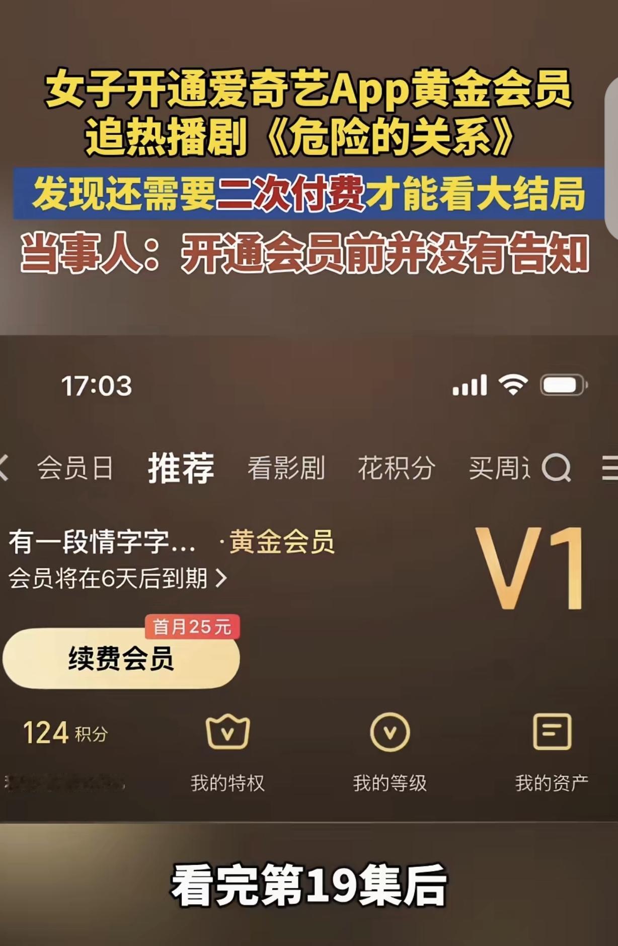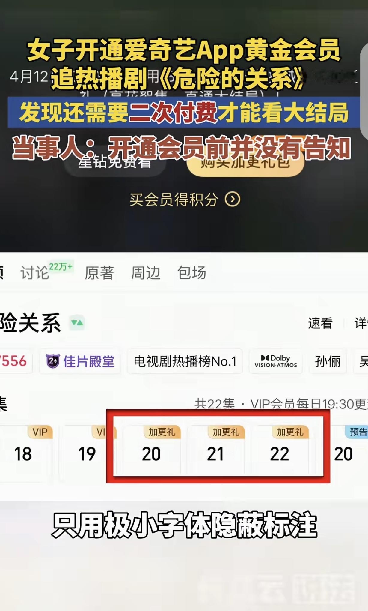 “套路防不胜防!”湖北武汉,一女子为了追22集电视剧《危险关系》,一咬牙花钱开通了某APP黄金会员,可看完19集后,提示她想看最后3集,得花18元或者60元买“加更礼”,才能在4月12日7点半前提前解锁大结局,女子气坏了,她开通会员前,咋不告诉她看结局还得花钱?会员还得二次付费,这算哪门子会员?平台客服回应,真是好气又好笑。网友:他不破产,你我都有责任!