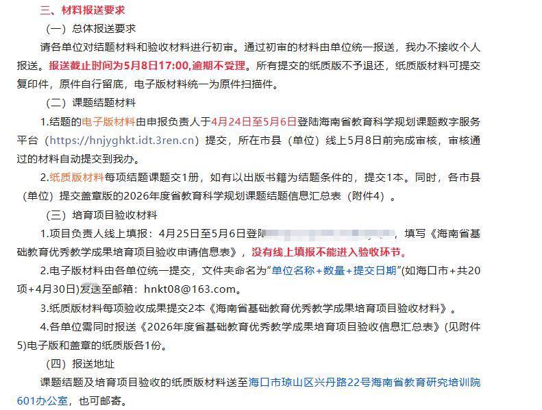 关于做好2026年度海南省教育科学规划课题结题暨培育项目验收的通知!材料报送要求