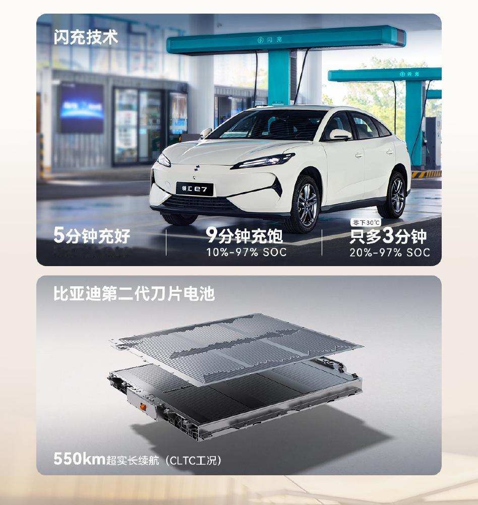 比亚迪又放出一台“价格屠夫”——领汇e7正式上市,官方指导价9.58万-11.58万元!直接把 10 万级纯电家轿的性价比拉到天花板!你没看错,一台车长4780mm、轴距2820mm的中级纯电轿车,起步价不到10万。关键是它全系标配了闪充技术:搭载第二代刀片电池,5分钟能从10%充到70%,9分钟就能充到97%!甚至零下30℃也能正常快充。这充电速度,你刷几个短视频的时间就能满电出发,彻底告别续航焦虑。我就问一句:10万级还有谁?