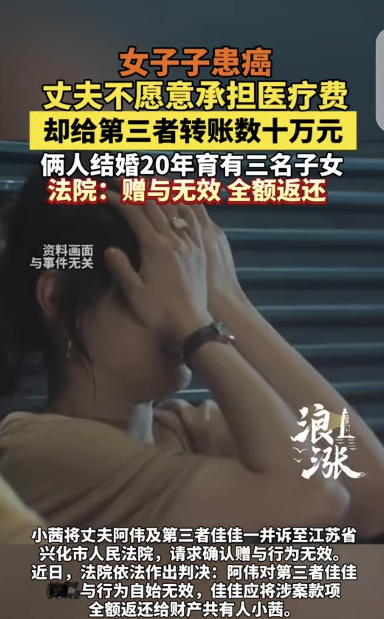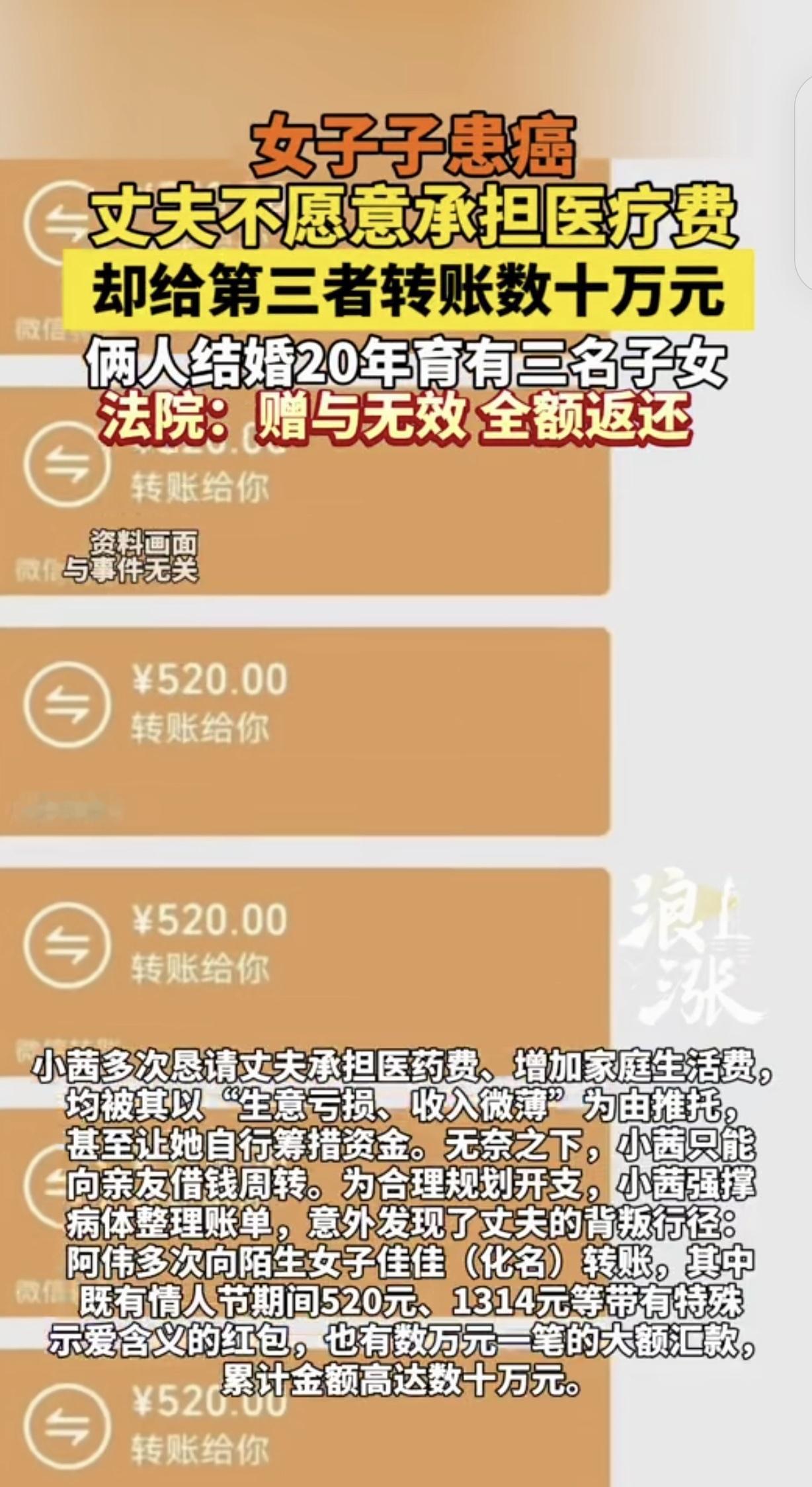 江苏泰州,一女子结婚20年,给丈夫生了3个儿女,2024年,女子被确诊恶性肿瘤,丈夫突然变脸,说生意赔钱,不但不给她拿钱看病,还让她自己去借医药费,女子无意间发现丈夫多次给一陌生女子转账520、1314,还有各种示爱红包,累计几十万,她这才知道丈夫变心了,她一纸诉状把丈夫和第三者告上法庭,法院判决大快人心。