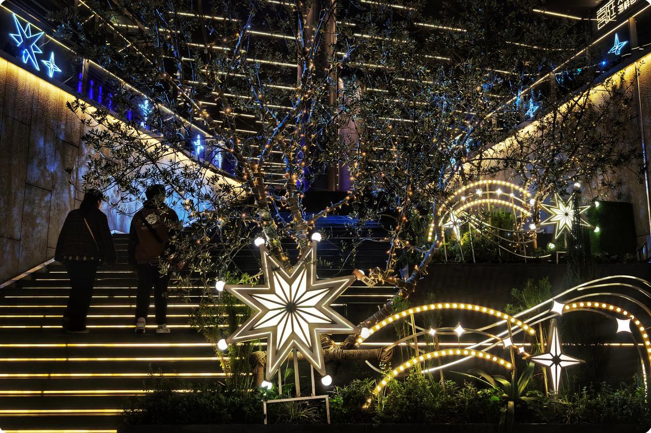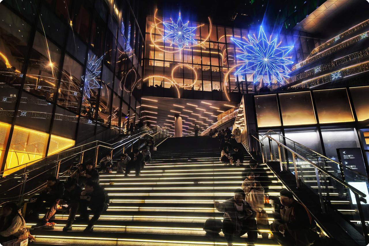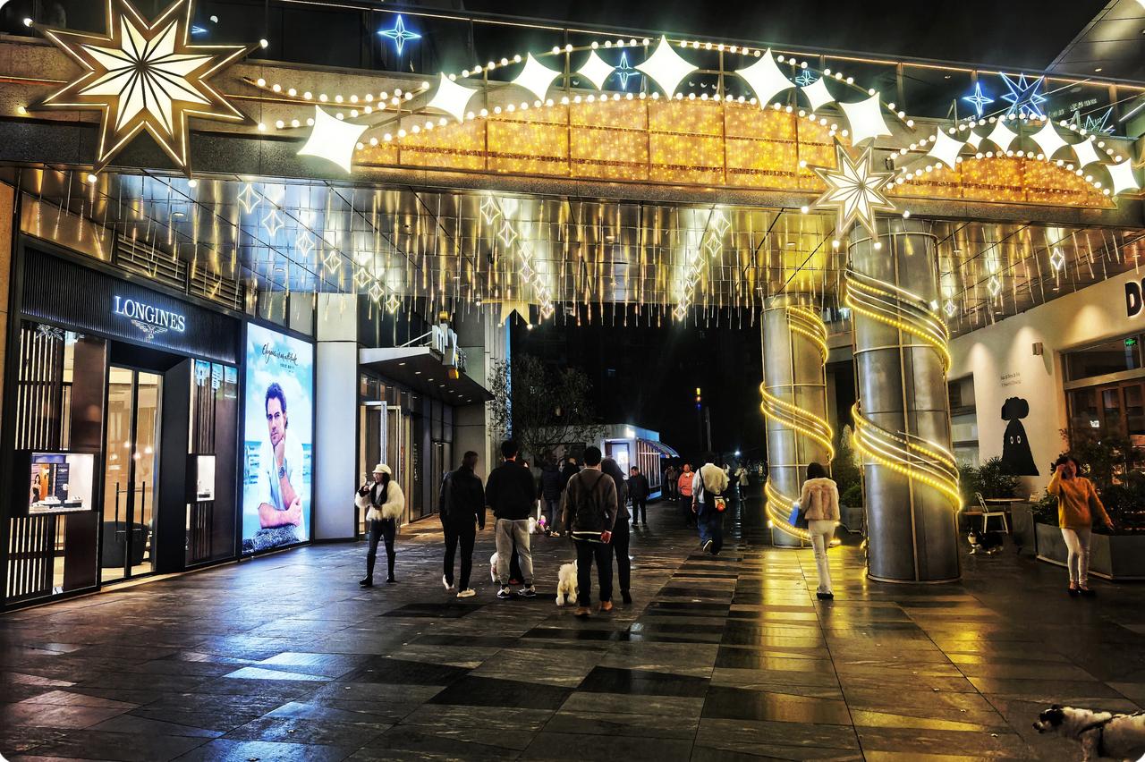 白天的它,是繁华的橱窗,商品琳琅满目似宝藏满仓。而此刻,灯光织就温柔的网,让喧嚣都变得如此安详。