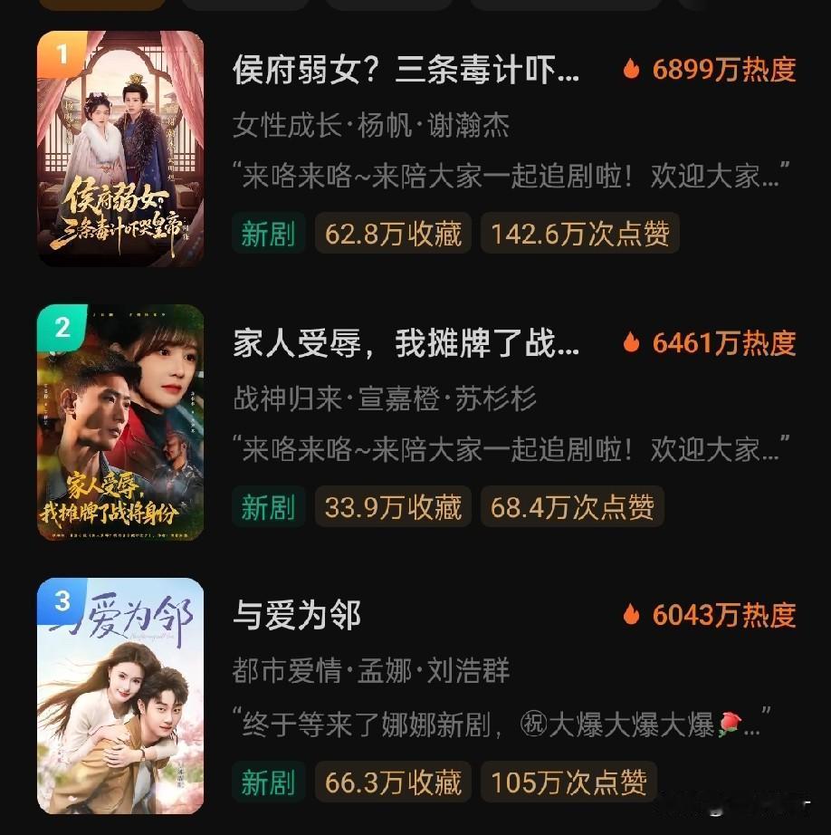 《与爱为邻》4月8日上线,播出2天后,4月10在红果的热度为6043万,占据新剧榜第三的位置!