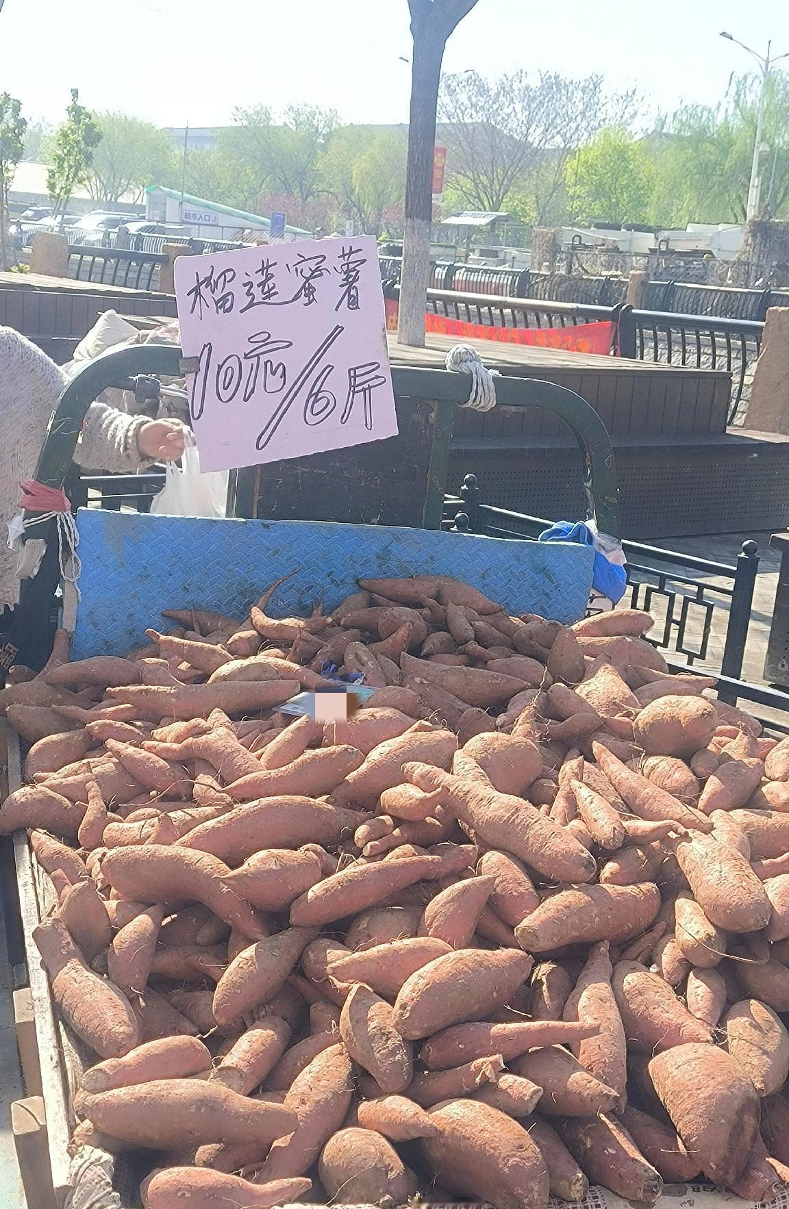今早到北河沿儿买菜,离西边入口不远,看到一个卖榴莲蜜薯的摊位,价格是真的便宜,10元6斤,摊主说是易县产的。