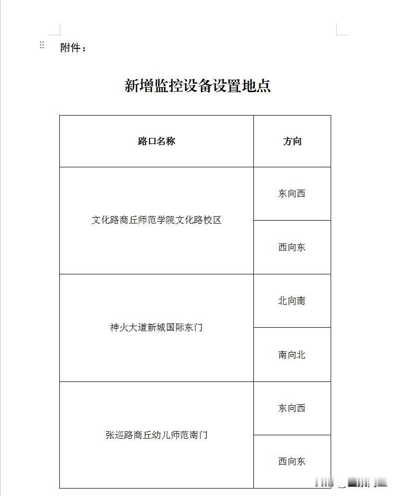 【商丘市公安局关于商丘市主城区新增交通技术监控设备启用的公告】为进一步规范交通秩序,加强道路交通安全管理,预防和减少道路交通事故,根据《中华人民共和国行政处罚法》《中华人民共和国道路交通安全法》《中华人民共和国道路交通安全法实施条例》《河南省道路交通安全条例》《道路交通安全违法行为处理程序规定》等法律法规规定,经上级主管部门批准,商丘市公安局交通管理支队在商丘市主城区3条道路新增6处交通技术监控设备,用于查处违反人行横道不停车让行、违反禁止标线指示、逆向行驶等交通违法行为。新增的交通技术监控设备自2026年4月10日起正式启用,现向社会公示交通技术监控设备设置地点,希望广大群众自觉遵守交通法规,共同维护道路交通安全和通行秩序。