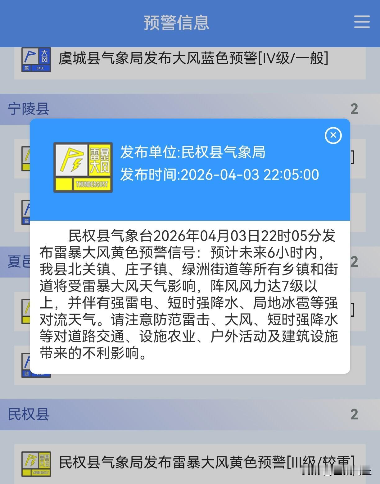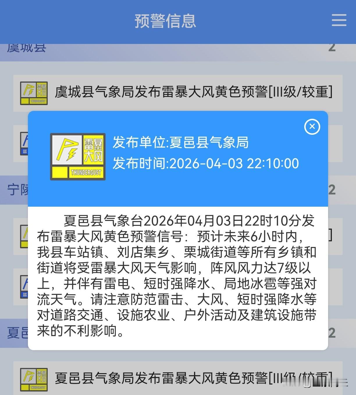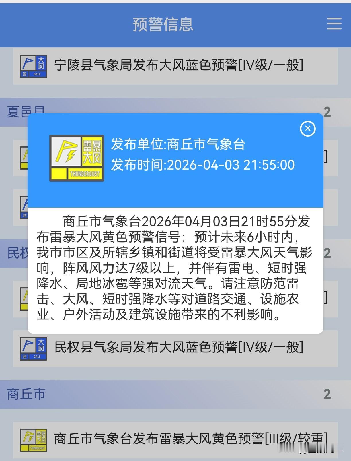 【商丘6地发布雷暴大风黄色预警】商丘市6地气象台2026年04月03日21时55分-22时14分分别发布雷暴大风黄色预警信号:预计未来6小时内,商丘市市区、民权县、夏邑县、宁陵县、虞城县、永城市及所辖乡镇和街道将受雷暴大风天气影响,阵风风力达7级以上,并伴有雷电、短时强降水、局地冰雹等强对流天气。请注意防范雷击、大风、短时强降水等对道路交通、设施农业、户外活动及建筑设施带来的不利影响。