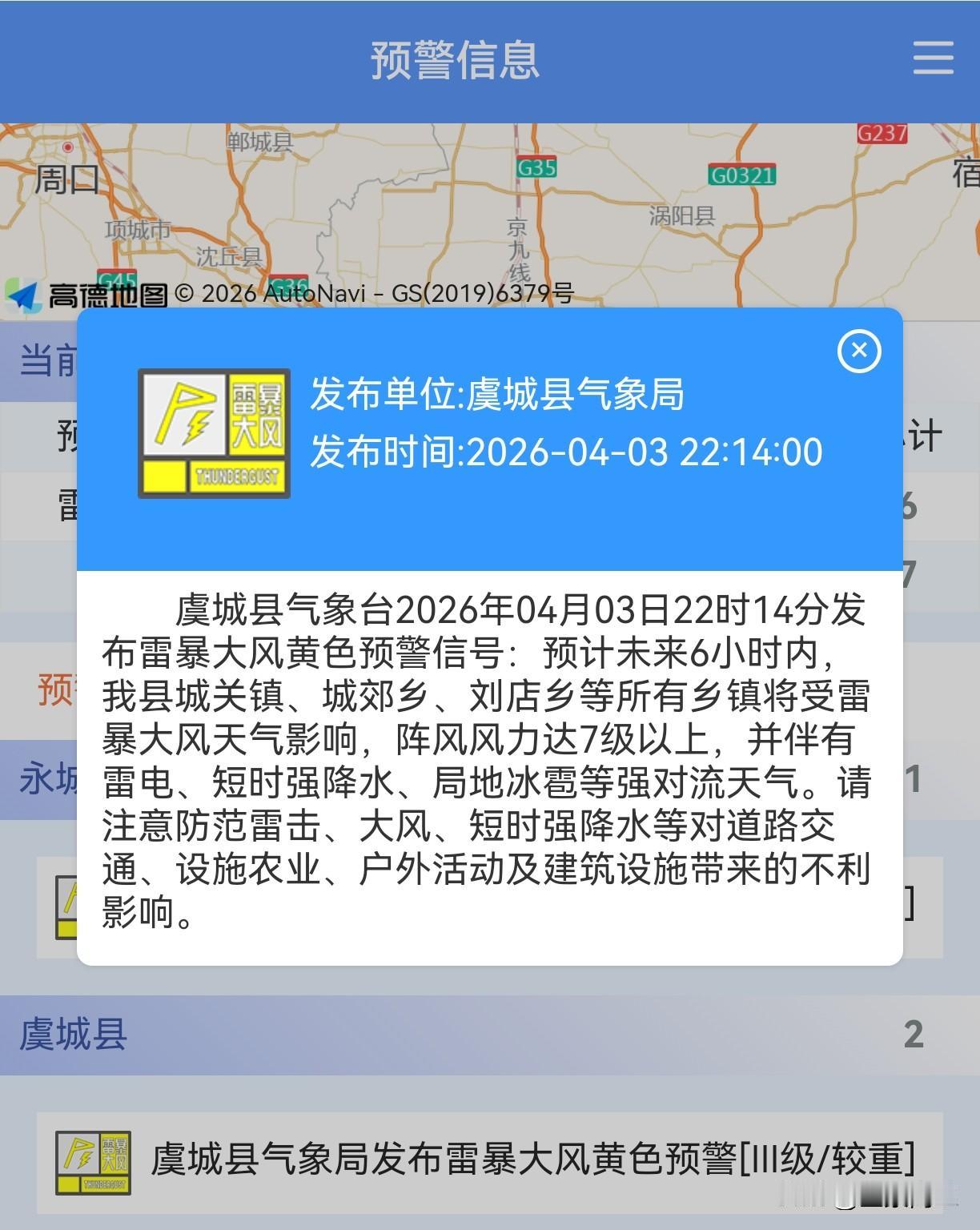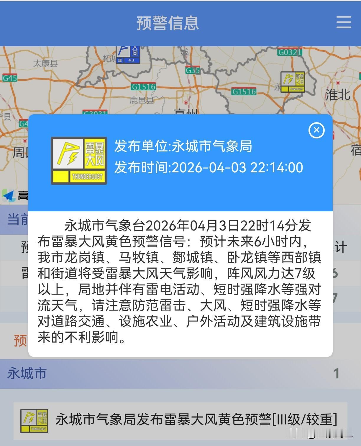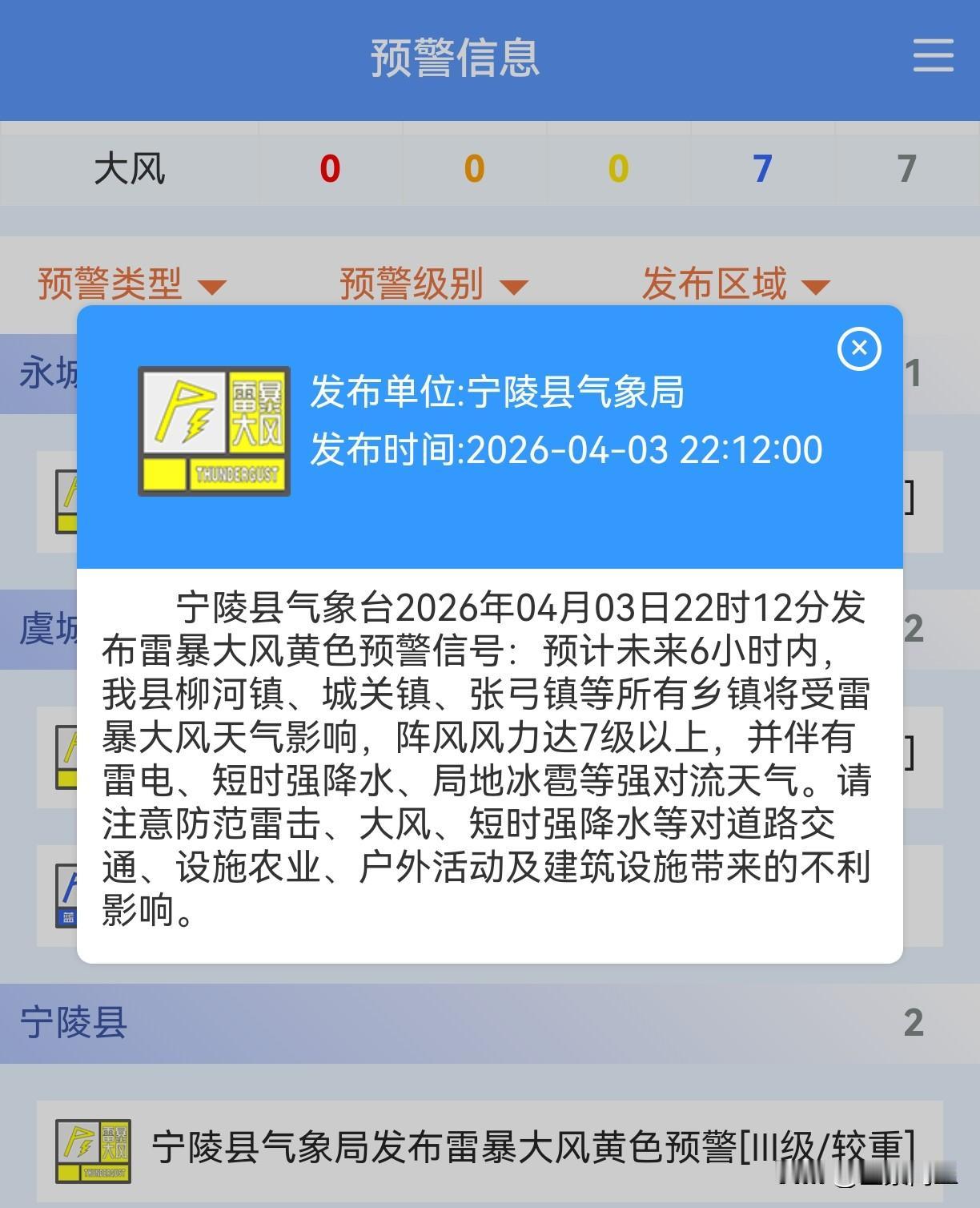 【商丘6地发布雷暴大风黄色预警】商丘市6地气象台2026年04月03日21时55分-22时14分分别发布雷暴大风黄色预警信号:预计未来6小时内,商丘市市区、民权县、夏邑县、宁陵县、虞城县、永城市及所辖乡镇和街道将受雷暴大风天气影响,阵风风力达7级以上,并伴有雷电、短时强降水、局地冰雹等强对流天气。请注意防范雷击、大风、短时强降水等对道路交通、设施农业、户外活动及建筑设施带来的不利影响。