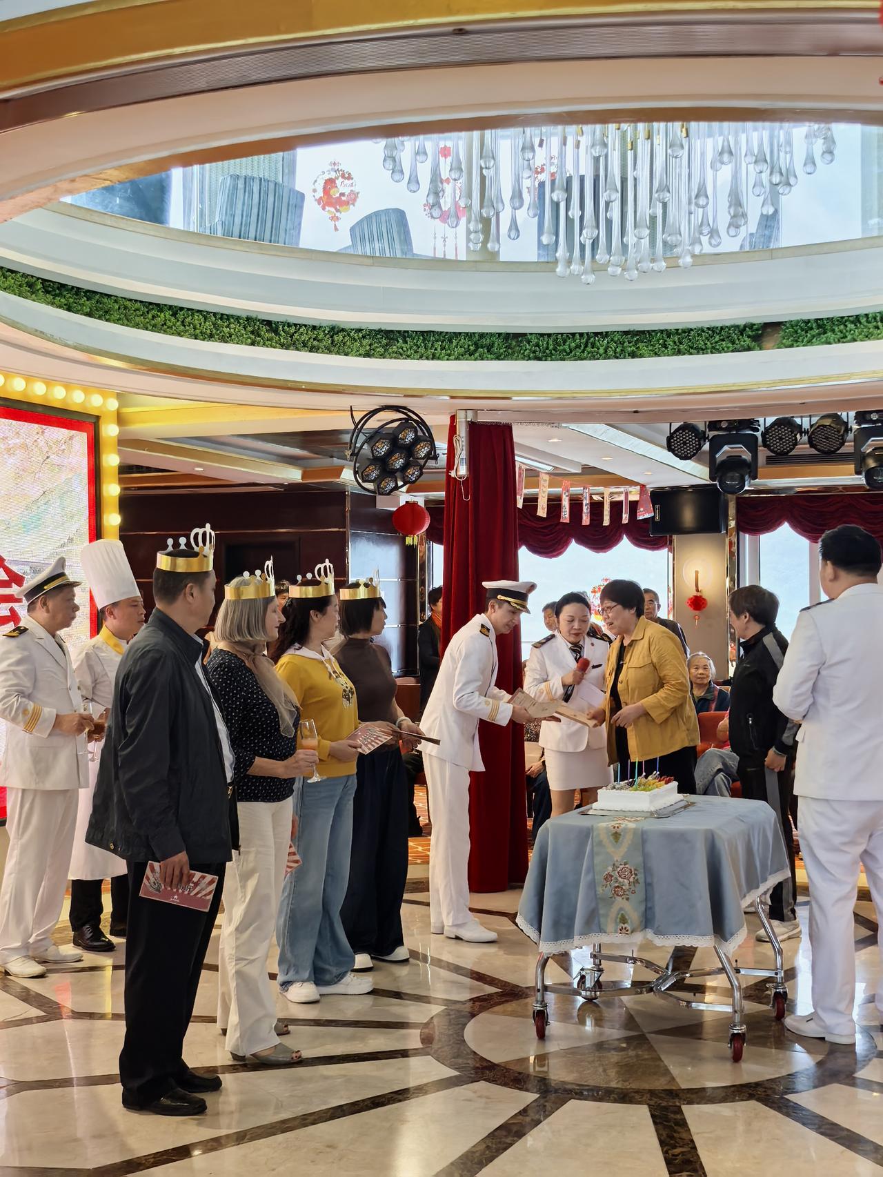 船长亲自给他们戴生日皇冠,和他们一起切蛋糕,协助他们吹生日蜡烛。这几位幸运者获得了全体乘客和船上工作人员的一致祝福。相信这个生日会给他们留下深刻的印象,一定会向自己的亲人朋友分享自己的喜悦。