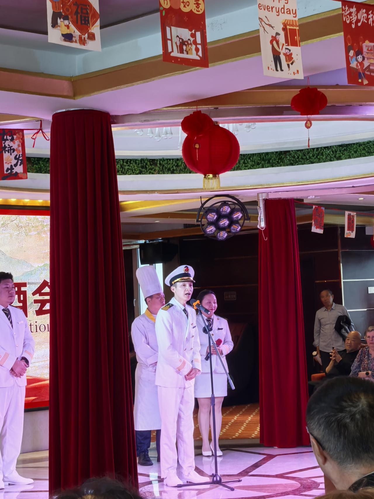 然后是正式内容。邮轮的高管站成一排,正装而立,主持人逐一介绍。船长发表了致辞,感觉比较公式化、程式化,但是对第1次乘船的游客来说还是比较新鲜。