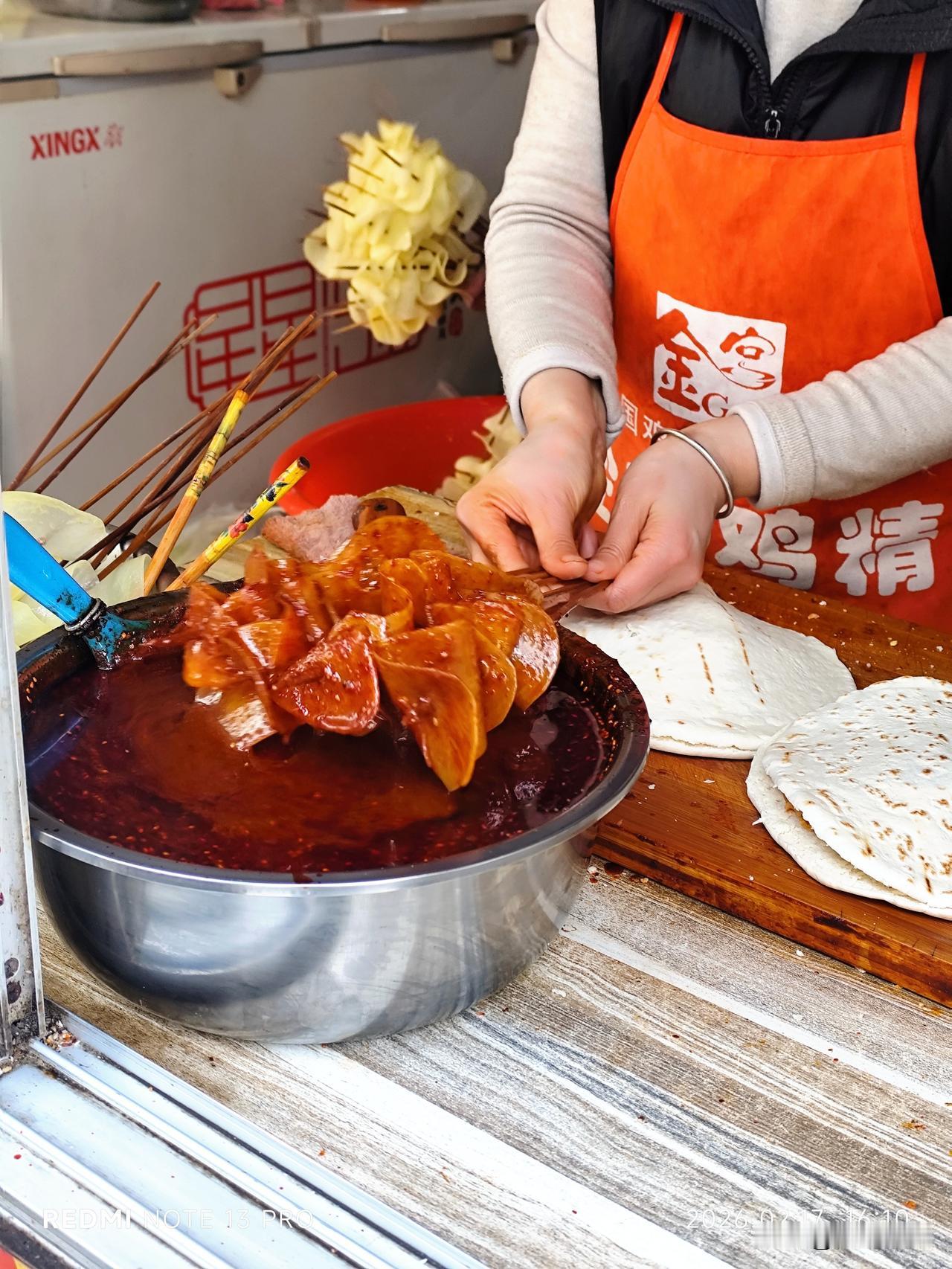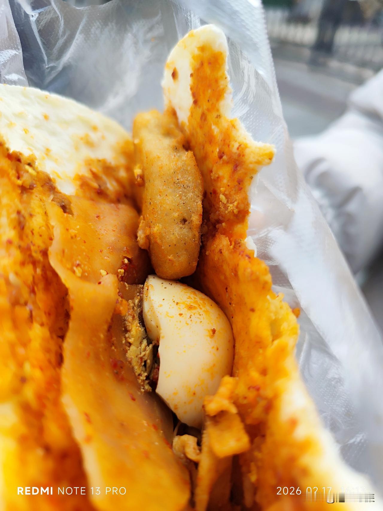 终于挪到窗口了,有加花干鸡蛋的,有加火腿的,我要的是全加的,接过热乎烫手的土豆夹馍,尝一口馍皮焦香,内里裹满脆嫩土豆片,红油渗进饼芯,麻与辣在舌尖炸开,所有等待都化作满足~